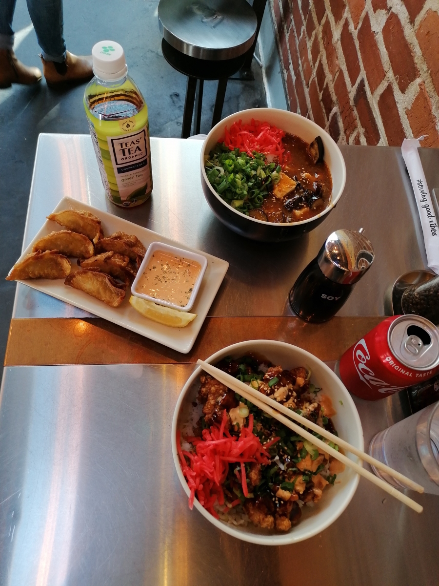 Damit war es fast Zeit abzuhauen, aber den Appetit wollten wir nicht mit auf die Reise nehmen. Es war dann doch komplizierter als gedacht einen fischreichen Imbiss (bevorzugt asiatisch) zu finden aber auch hier trug unsere Geduld Früchte und wir konnten uns zwei leckere Rice Bowls und WanTans gönnen – kein Fisch zwar aber verdammt asiatisch und verdammt schmackhaft.