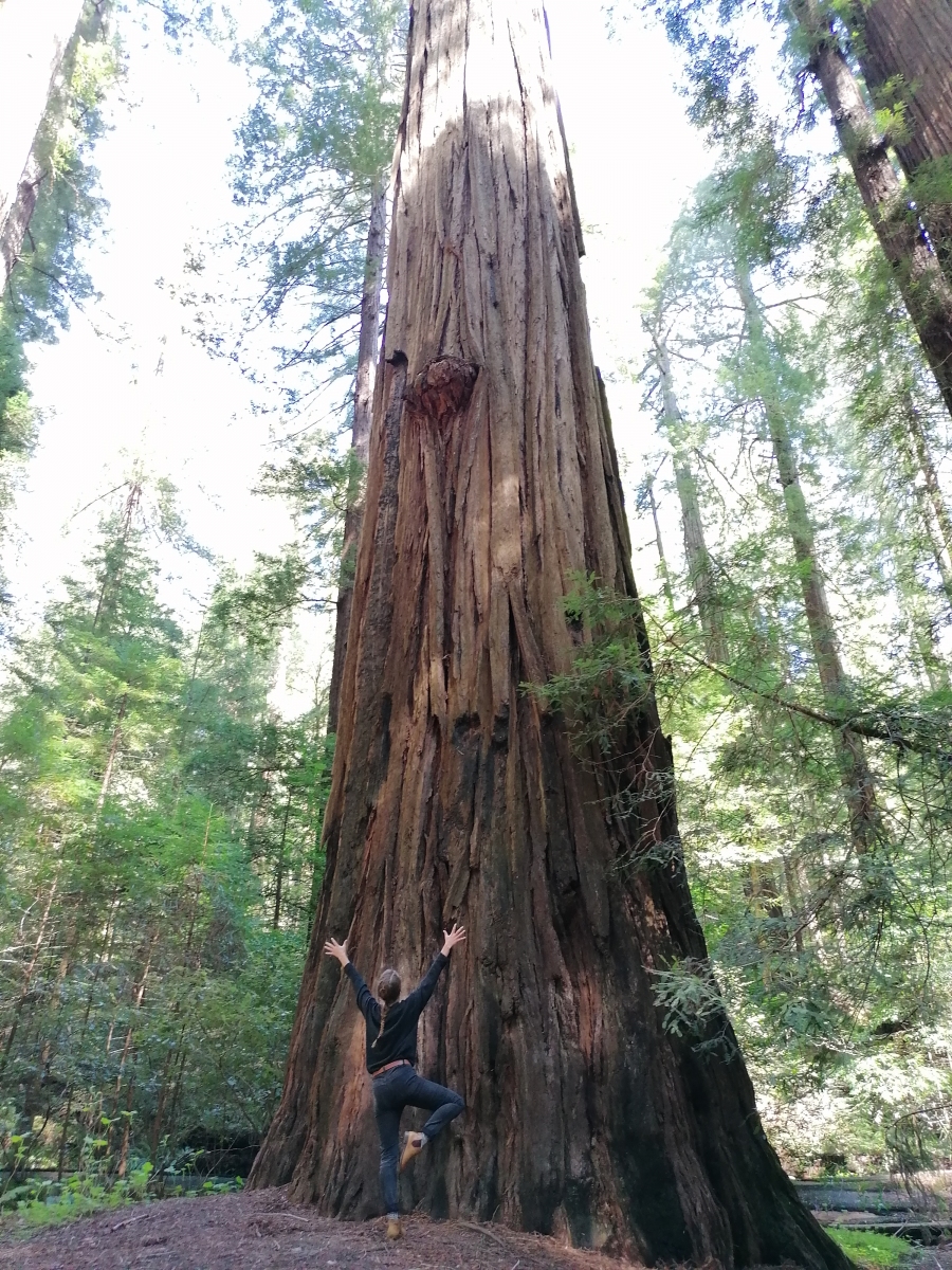 Der PCH brachte uns vom Ozean weg und wurde dann vom Highway 1 zur 101, was andeutete, dass es erstmal etwas weniger Seeblicke geben würde. Stattdessen kamen wir in dicke feuchte Wälder voller Farne und ziemlich großer Bäume. Relativ schnell beschlossen wir mal einen Stopp einzulegen um ein paar Eindrücke auch auf Bildern festhalten zu können. Es sah ein bisschen aus, wie bei Jurrasic Park. Farne in jeder Lücke, alle Bäume und Stümpfe üppig bewachsen, vielleicht etwas weniger junglig. Ein toller Wald, der das ozeanische Klima und die zugehörige Nässe optimal auszunutzen scheint. Wir entdeckten auch ein paar massive Baumstümpfe, die deutlich größer waren als alle umstehenden Bäume. Das mussten mal richtige Giganten gewesen sein. Ein bisschen entschädigte uns das dafür, nicht zu den Riesen-Bäumen im Sequoia Natl. Park gekommen zu sein – dachten wir zumindest. Was kurz darauf kam, war nicht geplant und für uns einfach ein riesen Geschenk auf der Tour. Es bot sich die Abzweigung von der 101 auf eine Parallel-Straße mit dem Namen „Avenue of the Giants“ an. Wir dachten uns, da würde es definitiv was zusehen geben, vielleicht ja ein paar mächtige Berge, Brücken oder ein zwei der Bäume, von denen wir nur Stümpfe hatten finden können. Was sich fand? Die Durchfahrt durch den Redwood State Park. Ein State Park, dessen Attraktion Küsten-Mammutbäume – die größten Bäume der Welt – sind. Die Begeisterung packte uns sofort. Wir fuhren weiter und es dauerte nicht lang bis sich Wälder mit absolut atemberaubenden Bäumen vor uns auftaten. Dicht an dicht standen die Giganten bis an die Straße und aus dem Auto konnte man teilweise deren Spitzen auf bis zu 130m(!) Höhe gar nicht erkennen. Wir haben natürlich häufig angehalten, sind umhergesprungen und haben Bilder gemacht und uns die Hälse verrenkt. Die tatsächlichen Ausmaße der bis zu 2000 Jahre alten Bäume waren einmal sehr gut zu erkennen, als wir an einem umgestürzten Exemplar vorbeikamen. Von der Spitze bis zur Wurzel noch ziemlich intakt lag das Ungetüm da und erstreckte sich wirklich ewig über den Waldboden. Natürlich haben wir die Mittagspause auch im Park verbracht (lecker Nudeln gekocht). Wir haben uns danach noch die Zeit genommen, durch den zum Park gehörenden Rockefeller Forest zu fahren – hier stehen 20% aller Küsten-Mammutbäume die es noch gibt. Herrlich, wenn einem die Reisepläne so durcheinander gebracht werden. Wir haben dabei zwei wichtige Dinge gelernt: unsere freiere Zeitplanung ist vielleicht gerade jetzt der bessere Plan und die Küsten-Mammutbäume sind höher, als die im Sequoia Natl. Park 😉
