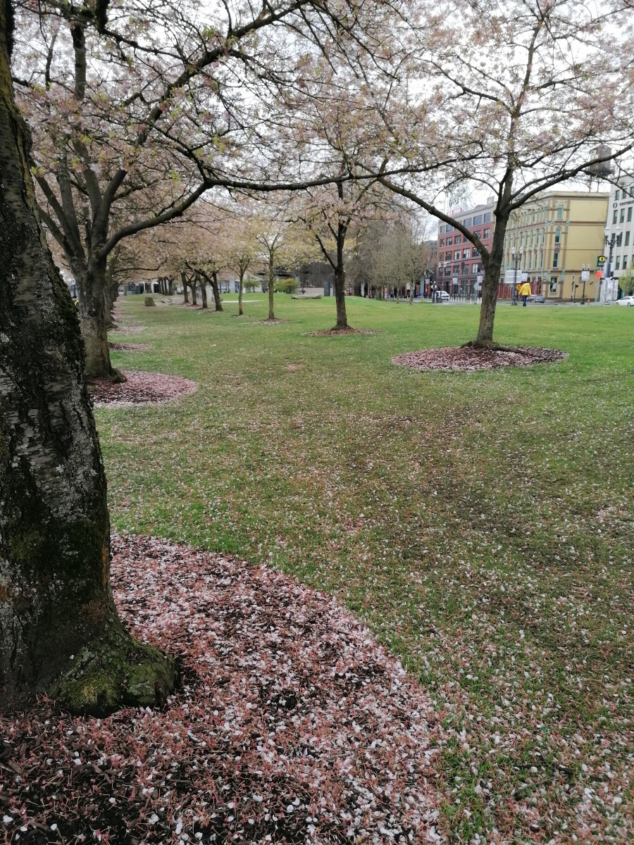 Unser Hotel hatte eine perfekte Lage, so dass wir die erste Tour zu Fuß machen konnten. Natürlich hatte in der Innenstadt fast alles geschlossen, aber davon ließen wir uns nicht aufhalten. Dann ist eben der Chinesische Garten geschlossen und der Springbrunnen im Keller Park trocken. Dennoch hatten wir einen tollen Spaziergang durch Old Town und Downtown Portland. Überall sind tolle alte Metallschilder zu finden, die meiner Meinung nach vorrangig die Stadt auszeichnen. Vorbei am Dante’s Inferno mit dem berühmten „Keep Portland Weird“-Wandbild und dem Must-See am Flussende von Old Town, dem „White Stag Sign“, stießen wir auf den Japanese American Historical Plaza. Dort gibt es eine Allee voller Kirschbäume, die auch im leicht verblühten Zustand einen gewissen Charme abgaben. Zwischen der Burnside Bridge und der Hawthorne Bridge folgten wir dem Waterfront Park Trail und suchten während dessen nach dem kleinsten Park der Welt. Der war wirklich nicht leicht zu finden. Doch wir haben nicht aufgegeben ;-). Ab dann drehten wir dem Fluss den Rücken zu und gingen Richtung Downtwon zum Keller Fountain Park und der Arlene Schnitzer Music Hall.