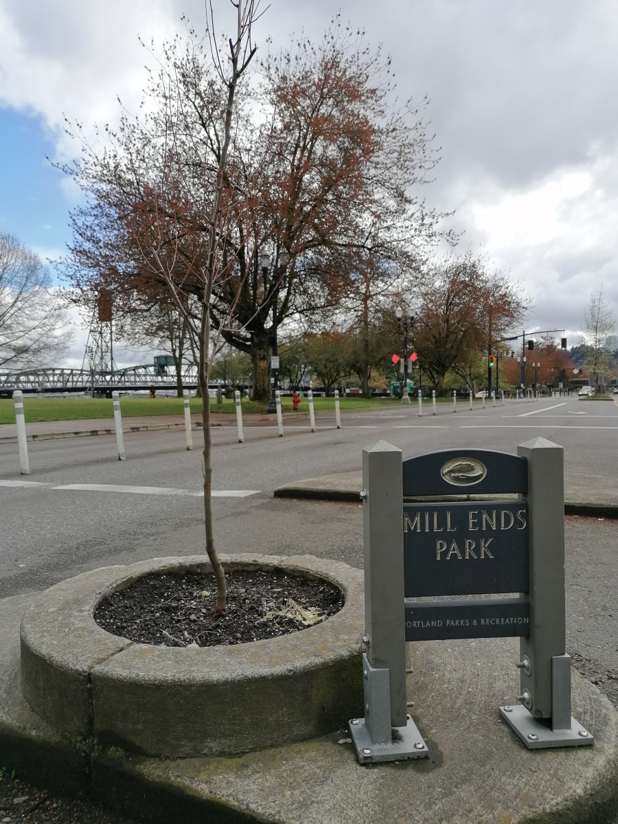 Unser Hotel hatte eine perfekte Lage, so dass wir die erste Tour zu Fuß machen konnten. Natürlich hatte in der Innenstadt fast alles geschlossen, aber davon ließen wir uns nicht aufhalten. Dann ist eben der Chinesische Garten geschlossen und der Springbrunnen im Keller Park trocken. Dennoch hatten wir einen tollen Spaziergang durch Old Town und Downtown Portland. Überall sind tolle alte Metallschilder zu finden, die meiner Meinung nach vorrangig die Stadt auszeichnen. Vorbei am Dante’s Inferno mit dem berühmten „Keep Portland Weird“-Wandbild und dem Must-See am Flussende von Old Town, dem „White Stag Sign“, stießen wir auf den Japanese American Historical Plaza. Dort gibt es eine Allee voller Kirschbäume, die auch im leicht verblühten Zustand einen gewissen Charme abgaben. Zwischen der Burnside Bridge und der Hawthorne Bridge folgten wir dem Waterfront Park Trail und suchten während dessen nach dem kleinsten Park der Welt. Der war wirklich nicht leicht zu finden. Doch wir haben nicht aufgegeben ;-). Ab dann drehten wir dem Fluss den Rücken zu und gingen Richtung Downtwon zum Keller Fountain Park und der Arlene Schnitzer Music Hall.