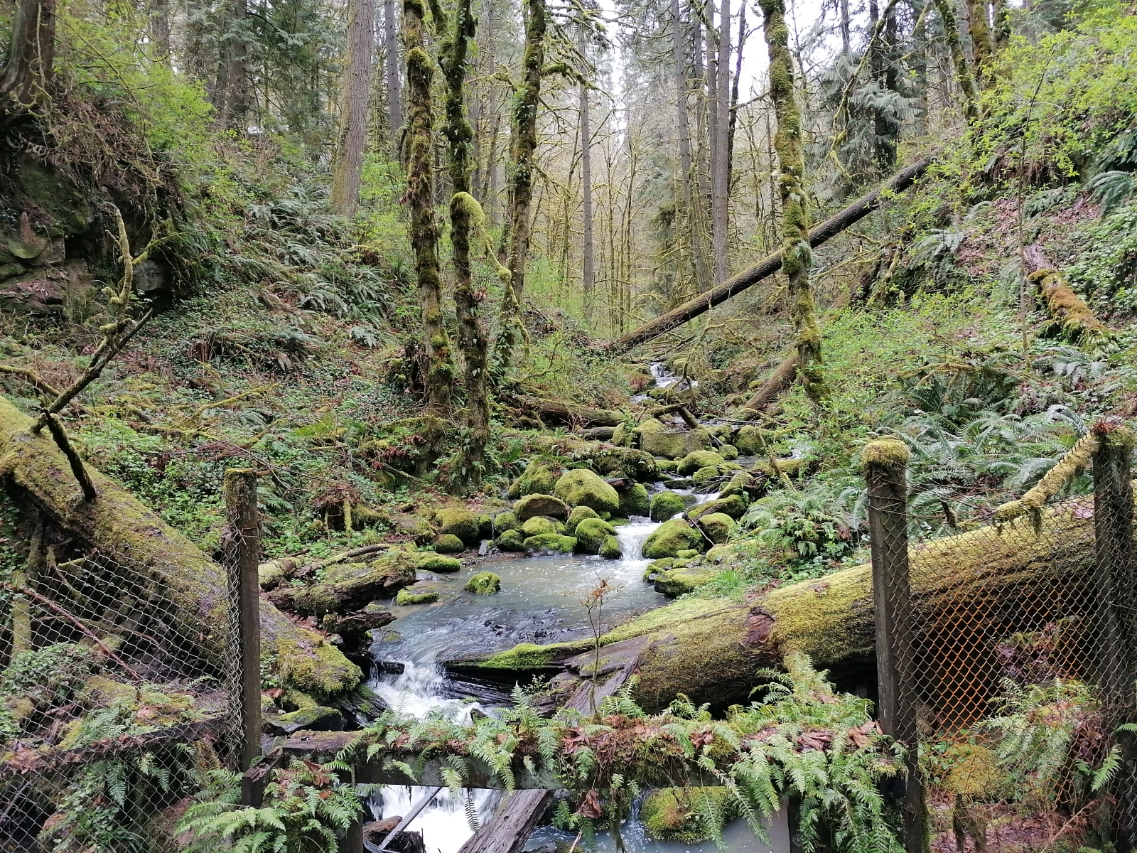 Weil der Wind aber nicht nachlassen wollte, wurden nicht mehr als fünf Löcher draus und wir fuhren weiter. Das war auch die letzte offene Anlage jedweder Art, die sich finden ließ. Wir fuhren und fuhren, mäßiges Wetter, keine Aussicht auf Obdach… Gibt bessere Voraussetzungen. Wir haben uns mit Hörbüchern (Danke Ceci!) und Musik abgelenkt und uns langsam in die nötige Stimmung gebracht: „Hauptsache IRGENDWO stehen“. Mit dem Credo auf den Lippen fuhren wir jetzt auch mal die kleineren Seitenstraßen kurz an um nach Möglichkeiten, einfach an ner Straße zu stehen, zu schauen. Nur am Highway direkt wollten wir auch wegen des Unfallrisikos nicht parken. Anfangs lief das nicht so toll. In jedem Loch, in das wir schauten, saß schon ne Maus drin. Es gibt also noch reichlich Nomaden wie uns hier. Dann auf einem Weg entlang eines kleinen Baches, der sich anfühlte wie ne Straße durch den Regenwald (hier hatte jeder Fleck an den Bäumen Moos), fanden wir was Adäquates. Parken, einrichten, gut is. Das beständige Tröpfeln des Regens ließ weder in der Nacht, noch am Morgen wirklich nach und so waren wir dann doch happy uns jetzt wieder der Zivilisation zuzuwenden. Next Stop: Portland, Oregon.