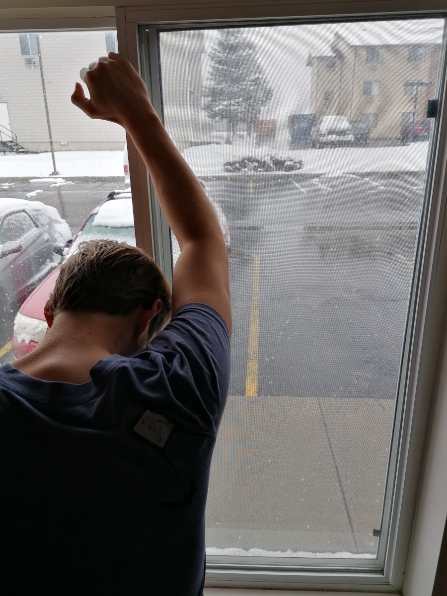 Am nächsten Tag ging es zur Abwechslung mal in ein Super 8 Motel (im Gegensatz zum oft genutzten Motel 6) und zwar in Butte. Das Beste in unserem Zimmer war definitiv der La-Z-Boy, der wohl allerbeste Sessel, den es auf der Welt gibt. In diesem Motel gab es ausnahmsweise Zugang zu kostenlosem Kaffee und am Morgen sogar eine Inklusivfrühstücksaufmerksamkeit. Aber auch Butte ging nicht ganz ohne Sport vorbei. Der Morgen hielt eine besondere Überraschung für uns bereit. 10cm Neuschnee o_O . Beim Auto-Freiräumen ließen wir uns also eine kurze Schneeschlacht (das Bälleformen haben wir uns mal gespart) nicht entgehen.