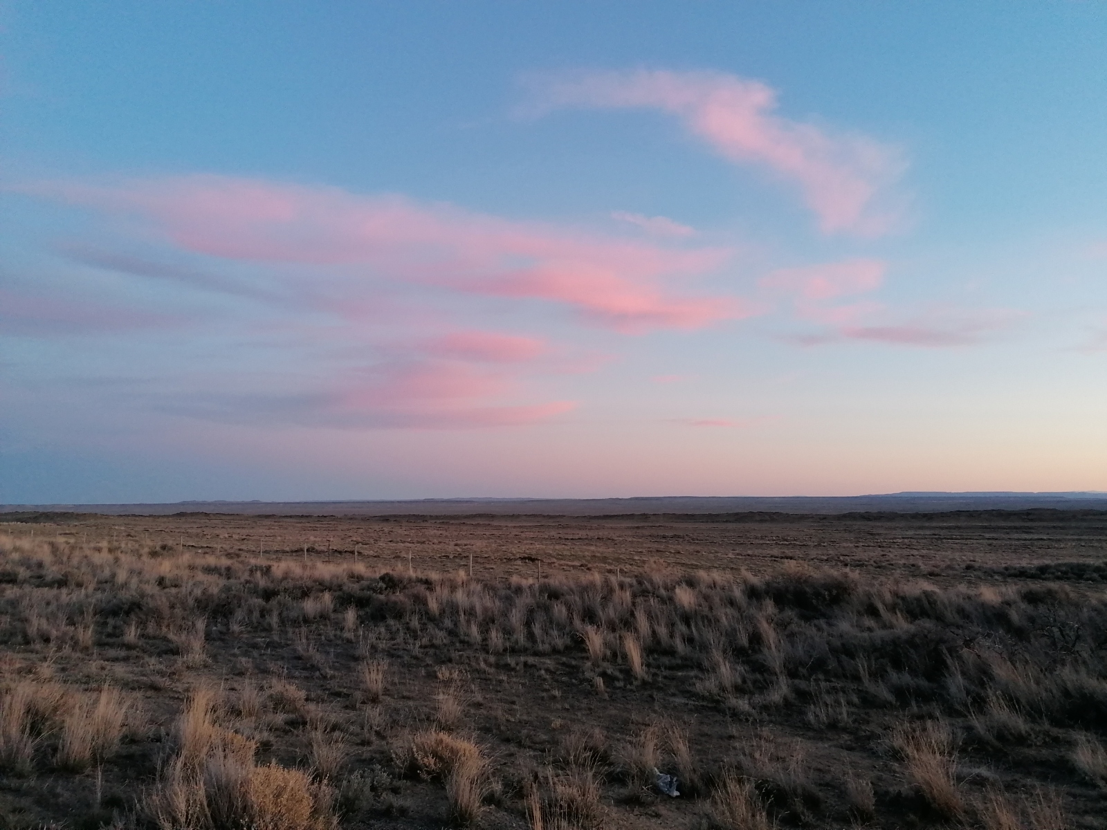 Danach brachten wir einfach mehr Meilen zwischen uns und die Westküste und sahen auch in Wyoming vieeel Land und Landwirtschaft. Wir hatten zum Glück schon vorher nen Spot für die Nacht rausgesucht, sonst hätte das ganz schön schwierig werden können. So mussten wir einfach nur von der großen Straße abfahren, ein paar Bahnschienen kreuzen, auf einem staubigen Feldweg noch zwei Farmen hinter uns lassen und waren Luftlinie 500m vom Highway mutterseelenallein in der Prärie. Die wird hier auch gern mal als trockenes Grasland abfällig abgetan, aber wir würden unseren Eindruck definitiv als „auch sehr schön“ beschreiben. Tina fühlte sich sogar an Südafrikas Steppen erinnert – ich würde das als Gütesiegel werten. Weil das Wetter sich schon kurz nach dem Bighorn wieder aufgehellt hatte konnten wir den Nachmittag und Abend dann draußen und im Gras verbringen, bevor wir uns ins Auto verkrochen.