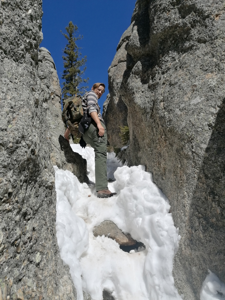 Pausiert war dann genug und es ging auf zum zweiten Gipfel, dem Black Elk Peak. Der Weg dorthin war wegen der halb angefrorenen, halb tauenden Schneedecke herausfordernd, aber zumindest die ganze Zeit wirklich schön. Hoch geschafft haben wir es dann auch und hatten damit den höchsten Gipfel nicht nur östlich der Rockies, sondern auch westlich der Pyrenäen (laut Infotafel) erreicht. Das Gipfelbierchen hatten wir uns damit verdient und auch hier oben ergab sich mit einem anderen Wanderer ein netter kleiner Schwatz. Keine hilfreichen Tipps diesmal, nur ein bisschen Football-Talk. Das tut ehrlich gesagt auch mal echt gut. Wir haben ja momentan, außer miteinander, meist nur Service-Kontakte. Da is so ein Plausch, auch auf 2207m Höhe, ne feine Sache.