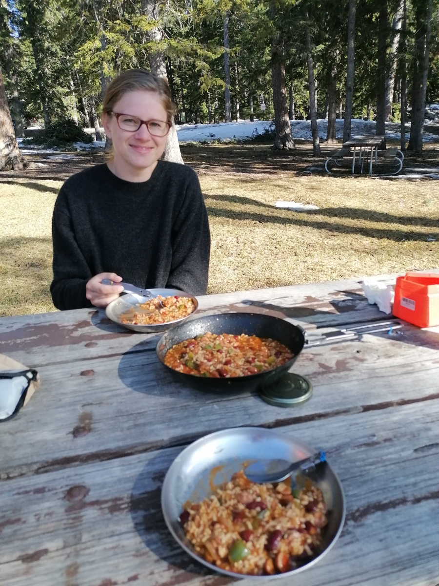 Der Weg zurück zum Sylvan Lake war dann zweierlei: wärmer, so dass wir auf T-Shirts runterdressen konnten, und schneereicher was die Wege angeht. Auch kamen immer mehr Leute diesen Weg entlang den Berg hinauf. Da konnten wir schon froh sein, dass wir unsere recht wasserfesten Stiefel anhatten. Manch einer kam nur in Converse-Stoffschuhen und die Härteste von allen mit Sandalen (!) – durch Schnee… Wir jedenfalls kamen ziemlich trockenen Fußes und halbwegs sicheren Schrittes ins Tal und waren happy und nicht zu erschöpft unsere Wanderung geschafft zu haben. Die Belohnung war ne große Chili-Pfanne, die wir direkt am See gekocht und verschlungen haben – Camping-Koch-Profis sag ich nur.
