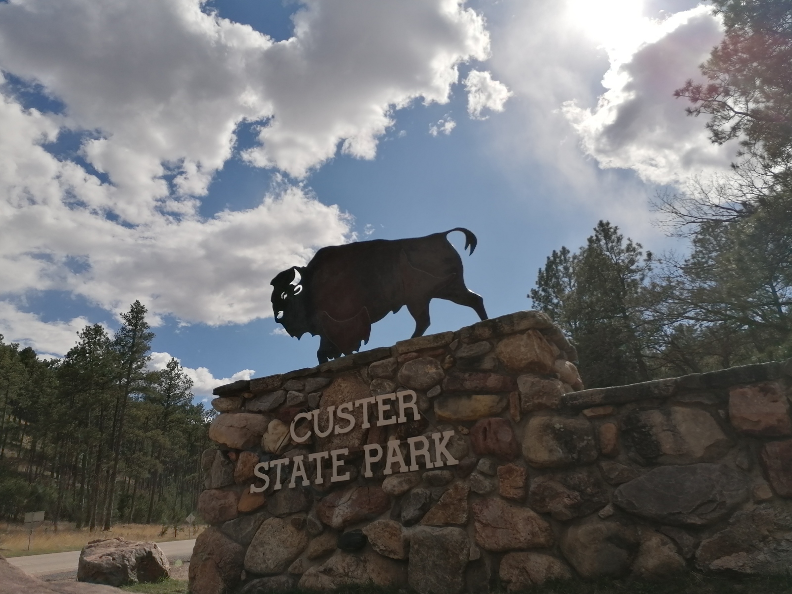 So, was hatten wir abgehakt? Mount Rushmore – check, Bergwanderung – check, Wildcampen – check und sogar ein kleines Sonnenbad… Ach ja, die Bisons. Wir haben von Bekannten den Custer State Park empfohlen bekommen. Ist Teil der Black Hills und hat nen tollen Loop, also ne Art Rundweg, auf dem man wohl ein paar Tiere sehen kann. Nachdem wir am Yellowstone nen Vorgeschmack auf Bisons bekommen hatten, aber nicht hinein durften, war da für uns noch ein Defizit aufzuholen. Auf dem Weg zum Loop konnte man etwas von der Geschichte der Gegend erfahren – heißt ja nicht nach General Custer ohne Grund – aber das war uns diesmal nicht so wichtig. Tiere gucken! Der Wildlife Loop war deshalb unser Ziel und schnell gefunden. Darauf rollten wir anfangs vorsichtig und aufmerksam spähend, um ja kein scheues Tierchen zu verschrecken. Nach der 12. oder 13. Kurve wurde uns klar, dass das etwas albern war. Da lagen und standen sie einfach rum. Bisons. Ne ordentliche Herde von mehr als hundert Tieren. Nicht dicht an dicht, aber doch überall. Auch ganz nah an der Straße, auch mit Kälbchen (ja, niedlich-Alarm). Das Wort kommt hier im Blog bestimmt oft vor, aber eben zurecht wenn es wie hier einfach mal „atemberaubend“ ist. Auf ner Infotafel konnten wir, nachdem ein Tier sich ein paar Meter weiter geschleppt hatte (zu nah möchten wir dann auch nicht ran), erfahren, dass hier rund 1000 bis 1500 Tiere die Herde im Park bilden und Landesweit immerhin wieder 350.000 leben. Als sich dann 15 Meter weiter zwei Bullen auch noch etwas anstänkerten und wir gleichzeitig lesen konnten, dass es früher 60.000.000 Tiere gab war das ein bittersüßer Moment. Toll das zu sehen, hart das mit der Info zu verknüpfen.