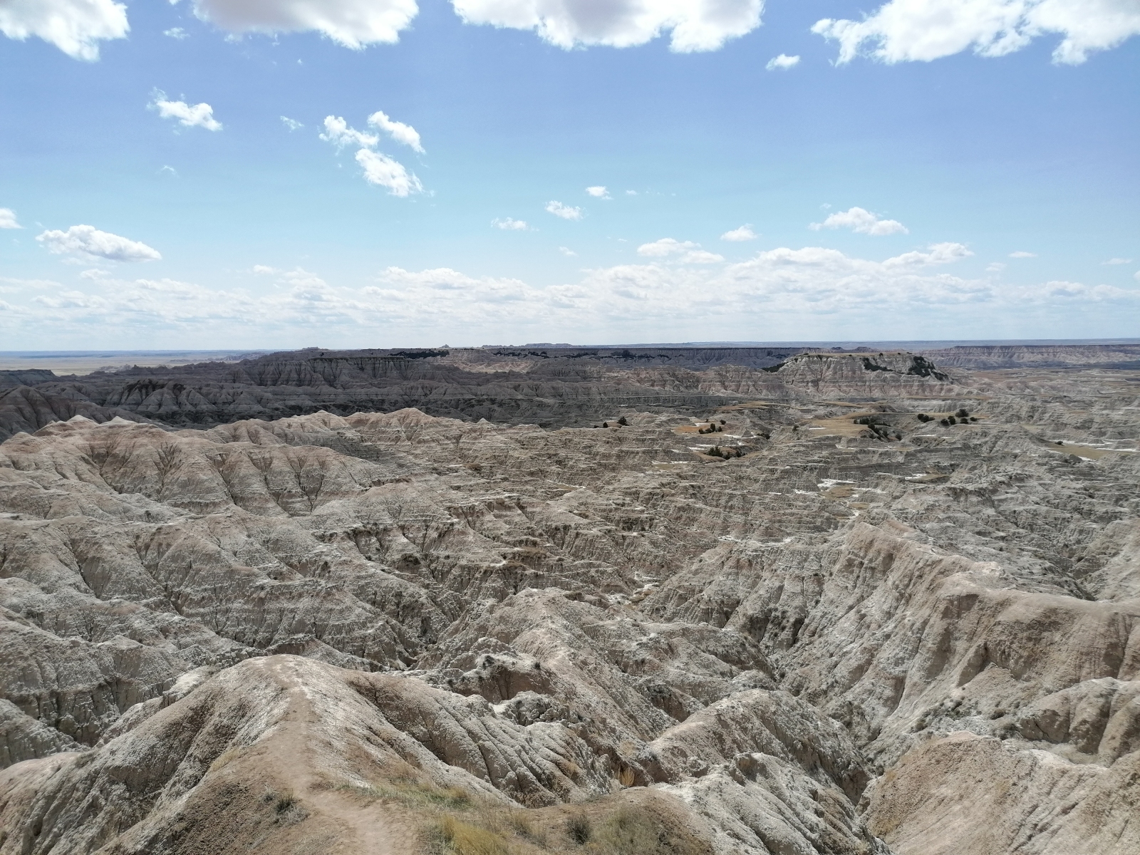 Es war gar nicht so weit. Innerhalb einer Stunde erreichten wir einen Eingang zum National Park, welcher offen, aber ohne Personal war. Der stand somit zumindest für eine Durchfahrt jedem kostenfrei zur Verfügung. Alle Aussichtspunkte, wo man auch immer etwas über die Gegend erfahren konnte, waren auch zugänglich. Weil wir nur grob wussten in welcher Richtung der Hauptteil des National Parks lag, fuhren wir lieber nach Schildern. So kamen wir nochmal raus aus dem Park und an einem anderen Eingang wieder hinein. Doch das war gut so. Denn dadurch haben wir auf dem Weg zu unser vorher rausgesuchten Schlafstelle schon den halben Park anschauen können. Hervorragende Aussichten empfingen uns und es wurde immer klarer, warum diese Gegend Badlands genannt wird. Büffel gab es auch hier zu sehen, aber diesmal haben eher die Präriehunde unsere Aufmerksamkeit bekommen. Zuerst sah es aus, als gäbe es gerade nichts weiter zu entdecken, als riesige Felder mit trockenem Gras und Dreck. Doch auf dem 2. Blick wuselte es überall. Sogar bis zum Straßenrand saßen sie in Alarmbereitschaft und warnten sich gegenseitig. Ein Stückchen weiter stand dann auch ein Schild mit der Aufschrift „Town of Prairie Dogs“. Ich denke, das traf es auf den Kopf – es quiekte und wuselte überall.