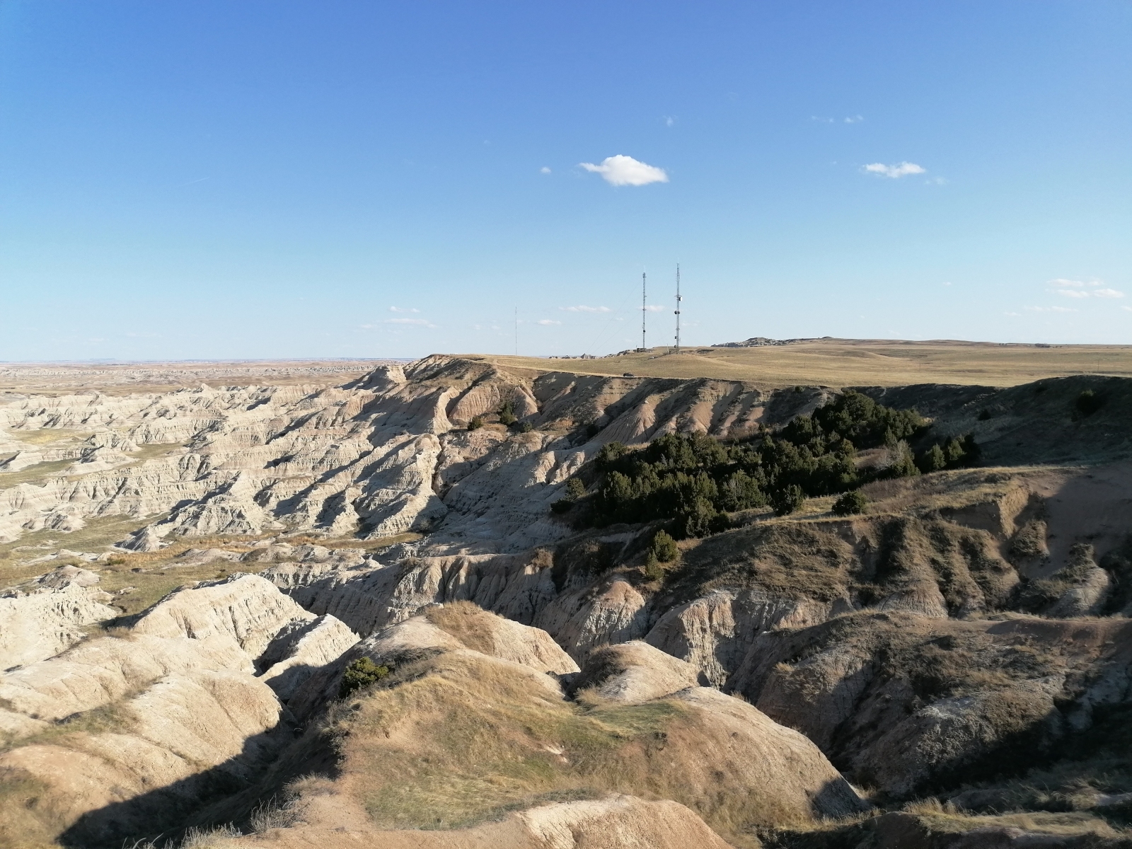 Es war gar nicht so weit. Innerhalb einer Stunde erreichten wir einen Eingang zum National Park, welcher offen, aber ohne Personal war. Der stand somit zumindest für eine Durchfahrt jedem kostenfrei zur Verfügung. Alle Aussichtspunkte, wo man auch immer etwas über die Gegend erfahren konnte, waren auch zugänglich. Weil wir nur grob wussten in welcher Richtung der Hauptteil des National Parks lag, fuhren wir lieber nach Schildern. So kamen wir nochmal raus aus dem Park und an einem anderen Eingang wieder hinein. Doch das war gut so. Denn dadurch haben wir auf dem Weg zu unser vorher rausgesuchten Schlafstelle schon den halben Park anschauen können. Hervorragende Aussichten empfingen uns und es wurde immer klarer, warum diese Gegend Badlands genannt wird. Büffel gab es auch hier zu sehen, aber diesmal haben eher die Präriehunde unsere Aufmerksamkeit bekommen. Zuerst sah es aus, als gäbe es gerade nichts weiter zu entdecken, als riesige Felder mit trockenem Gras und Dreck. Doch auf dem 2. Blick wuselte es überall. Sogar bis zum Straßenrand saßen sie in Alarmbereitschaft und warnten sich gegenseitig. Ein Stückchen weiter stand dann auch ein Schild mit der Aufschrift „Town of Prairie Dogs“. Ich denke, das traf es auf den Kopf – es quiekte und wuselte überall.