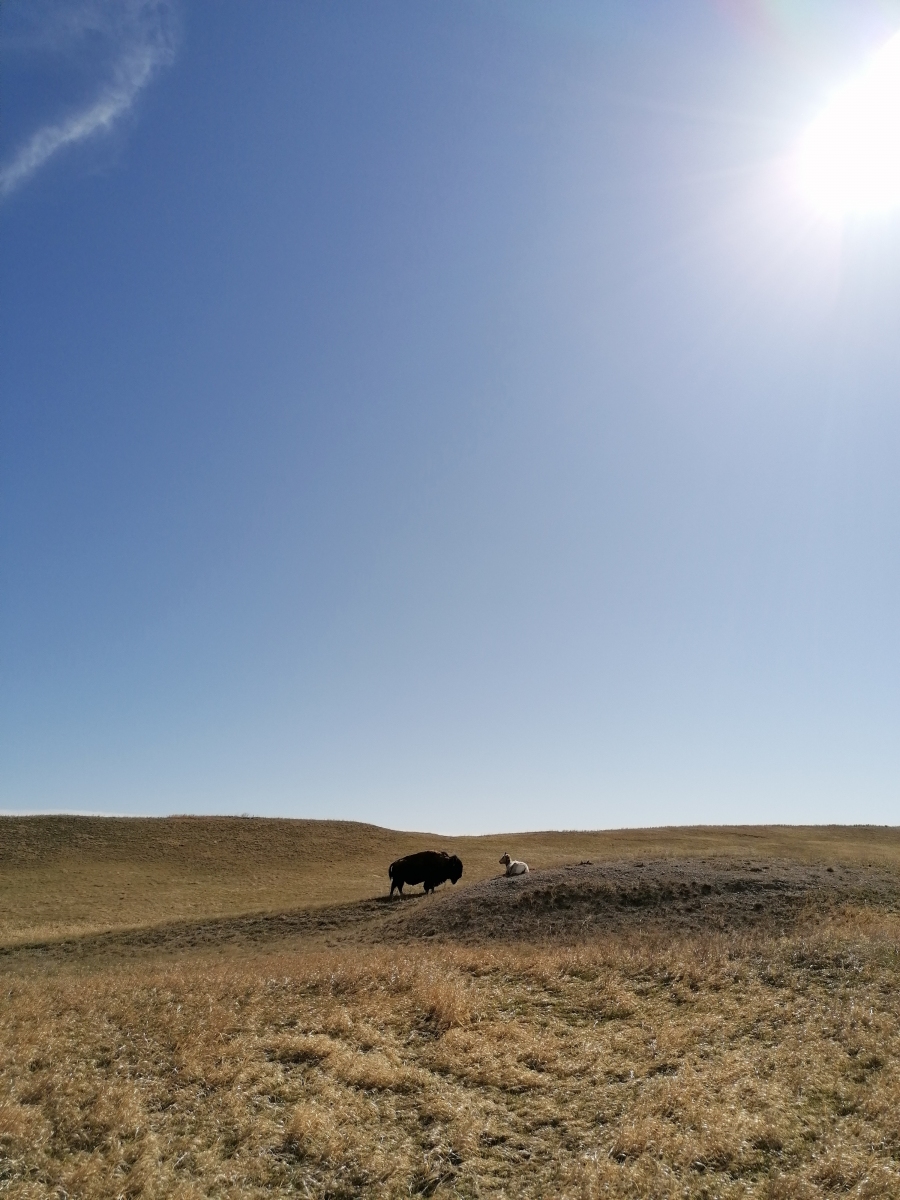 So, was hatten wir abgehakt? Mount Rushmore – check, Bergwanderung – check, Wildcampen – check und sogar ein kleines Sonnenbad… Ach ja, die Bisons. Wir haben von Bekannten den Custer State Park empfohlen bekommen. Ist Teil der Black Hills und hat nen tollen Loop, also ne Art Rundweg, auf dem man wohl ein paar Tiere sehen kann. Nachdem wir am Yellowstone nen Vorgeschmack auf Bisons bekommen hatten, aber nicht hinein durften, war da für uns noch ein Defizit aufzuholen. Auf dem Weg zum Loop konnte man etwas von der Geschichte der Gegend erfahren – heißt ja nicht nach General Custer ohne Grund – aber das war uns diesmal nicht so wichtig. Tiere gucken! Der Wildlife Loop war deshalb unser Ziel und schnell gefunden. Darauf rollten wir anfangs vorsichtig und aufmerksam spähend, um ja kein scheues Tierchen zu verschrecken. Nach der 12. oder 13. Kurve wurde uns klar, dass das etwas albern war. Da lagen und standen sie einfach rum. Bisons. Ne ordentliche Herde von mehr als hundert Tieren. Nicht dicht an dicht, aber doch überall. Auch ganz nah an der Straße, auch mit Kälbchen (ja, niedlich-Alarm). Das Wort kommt hier im Blog bestimmt oft vor, aber eben zurecht wenn es wie hier einfach mal „atemberaubend“ ist. Auf ner Infotafel konnten wir, nachdem ein Tier sich ein paar Meter weiter geschleppt hatte (zu nah möchten wir dann auch nicht ran), erfahren, dass hier rund 1000 bis 1500 Tiere die Herde im Park bilden und Landesweit immerhin wieder 350.000 leben. Als sich dann 15 Meter weiter zwei Bullen auch noch etwas anstänkerten und wir gleichzeitig lesen konnten, dass es früher 60.000.000 Tiere gab war das ein bittersüßer Moment. Toll das zu sehen, hart das mit der Info zu verknüpfen.