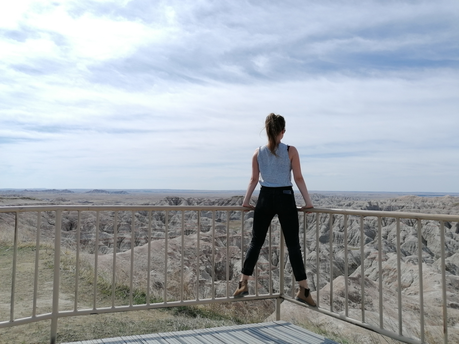 Wir hielten auch an jedem View Point und es sah immer ein bisschen anders aus. Doch was so ziemlich alle Aussichten gemeinsam hatten, war natürlich die Trockenheit! Der erste Teil der Badlands-Tour war wunderschön und vollkommen anders von dem, was wir bisher auf unserer Reise gesehen haben. Als wir ganz in der Nähe von unserem Campingspot befanden, sind wir dann am frühen Nachmittag erstmal wieder aus dem Park hinausgefahren. Kaum einen Kilometer vorm Nordeingang befand sich schon die Zufahrt zu unseren außergewöhnlichen Schlafplatz. Dieser lag direkt an der Kante vor einem riesigen Tal voller epischem Nichts – eine leicht hypnotische Aussicht. Es war so viel, der Blick so weit, alles sah so ähnlich aus, so dass man den Blick schweifen ließ und die Zeit absolut unwichtig wurde. Nachdem wir unser Mittag im Auto zubereitet und zu uns genommen hatten, da es ziemlich windig war, machten wir eine Mittagspause im Auto mit geöffnetem Kofferraum und genossen die Aussicht. Als wir uns nicht mehr zu voll gefuttert fühlten, machten wir einen kleinen Spaziergang und versuchten auch in das Tal hinunter zu kommen. Ein Stückchen war das möglich, aber dann wurden die Abgänge viel zu steil. Dann eben nicht! Auf einer großen gelben Wiese kann man schließlich auch Spaß haben. Paul rannte den Hügel runter und musste so feststellen, dass in der Wiese doch mehr los war als erwartet. Dabei wollte er nur wissen, wo die Vögel sind, die die ganze Zeit so einen Krach machten, aber nicht zu sehen waren. Ich saß einfach solange im Gras und lauschte den verschiedenen Geräuschen. Kurz bevor Paul wieder zurück bei mir war, entdeckte er eine Schlange. Ich ging schnell zu ihm um sie zu betrachten. Sie war immer noch da und wir konnten sie im Detail begutachten – Sie hatte einen orangen Streifen und war ca. 80 Zentimeter lang. Doch dann fing es an noch mehr vor unseren Füßen zu rascheln. Diese Schlange war nicht allein unterwegs! Es waren mindesten drei an der selben Stelle o_O. Faszinierend. Ehrlich gesagt, konnte ich mich dann auch nicht nochmal soooooo entspannt ins Gras setzen. Paul übrigens auch nicht, er entdeckte mit seinen hinteren Sensoren, dass unter dem höheren Gras auch Kakteen wuchsen. Autschi. Also haben wir den Tag lieber mit Gemütlichkeit im Auto beendet.