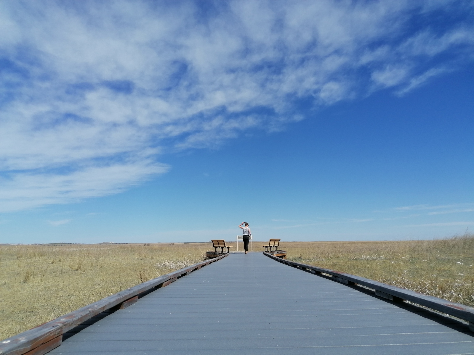 Danach brachten wir einfach mehr Meilen zwischen uns und die Westküste und sahen auch in Wyoming vieeel Land und Landwirtschaft. Wir hatten zum Glück schon vorher nen Spot für die Nacht rausgesucht, sonst hätte das ganz schön schwierig werden können. So mussten wir einfach nur von der großen Straße abfahren, ein paar Bahnschienen kreuzen, auf einem staubigen Feldweg noch zwei Farmen hinter uns lassen und waren Luftlinie 500m vom Highway mutterseelenallein in der Prärie. Die wird hier auch gern mal als trockenes Grasland abfällig abgetan, aber wir würden unseren Eindruck definitiv als „auch sehr schön“ beschreiben. Tina fühlte sich sogar an Südafrikas Steppen erinnert – ich würde das als Gütesiegel werten. Weil das Wetter sich schon kurz nach dem Bighorn wieder aufgehellt hatte konnten wir den Nachmittag und Abend dann draußen und im Gras verbringen, bevor wir uns ins Auto verkrochen.