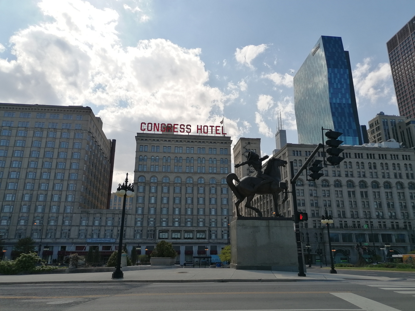 Wir beide waren gespannt, was uns erwartet. Doch bevor es zu unserem Start des Stadtspaziergangs ging, besuchten wir das United Center (Stadion der Chicago Bulls), um die Michael Jordan Statue zu sehen. Natürlich war das Stadium weit abgesperrt. Dennoch fuhren wir ringsherum und liefen auch nochmal alle Seiten ab. Was wir zu dem Zeitpunkt noch nicht wussten, war, dass die Statue 2017 nach drin verlegt wurde. Das erschwerte die Betrachtung etwas. Es war etwas enttäuschend, v.a. für Riesenfan Paul. Doch das hielt uns nicht auf zur Michigan Avenue zufahren, um von dort aus unseren Rundgang zu beginnen. Auf der Fahrt bemerkten wir am Ufer des Michigan See immer mehr Menschen, die auf irgendwas warteten. Unter den gegebenen Umständen waren es definitiv zu viele Menschen. Als diese dann alle gleichzeitig in eine Richtung starrten und die Handys rausholten, war klar das irgendwas gleich losgehen wird. Doch was? Alle Sportarten sind schließlich abgesagt worden. Und dann sah ich es aus dem Heckfenster. Vier Kunstflieger der Blue Angels, die über den Lake Michigan flogen. So ein Quatsch. Bei einer nachträglichen Recherche fanden wir heraus, dass es sich dabei um einen Überflug von Michigan nach Indiana handelte, der zur Anerkennung und Dankbarkeit für die systemrelevanten Arbeiter veranstaltet wurde. Wir sind davon nicht überzeugt. Die Kosten für den Überflug hätten auf jeden Fall besser genutzt werden können. Naja, das ist eben Amerika – militärfanatisch. Das Auto wurde dann bei der nächsten Gelegenheit abgestellt und es ging endlich zu Fuß weiter. Wir staunten und guckten und fühlten uns sehr wohl in dieser Stadt. Der Architekurmix zwischen alt und modern funktioniert einfach super gut. Den besten Eindruck davon bekommt man an einer der Brücken nach Downtown, von wo ein paar tolle Ansichten zu sehen waren. Wir fanden an Sehenswürdigkeiten bspw. die silberne Bohne, den Beginn der Route 66 und den alten Water Tower. Nachdem wir einige Kilometer geschafft hatten, machten wir unsere Pause mit einer leckeren Deep Dish Pizza von Lou Malnatis (lag halt um die Ecke). Für mich persönlich muss die hackfleischähnliche Wurst nicht unbedingt auf der Pizza sein, aber dennoch war es mega um den Hunger zu stillen. Der Spitzname „Tomatentorte“ passt auf jeden Fall zu der Pizza wie die Faust auf’s Auge. Zu guter Letzt entschieden wir eine weitere Runde durch die Michigan Avenue zu fahren und den Gesamteindruck für uns auf Video festzuhalten. Denn allein auf Bildern war das nicht so ganz möglich.