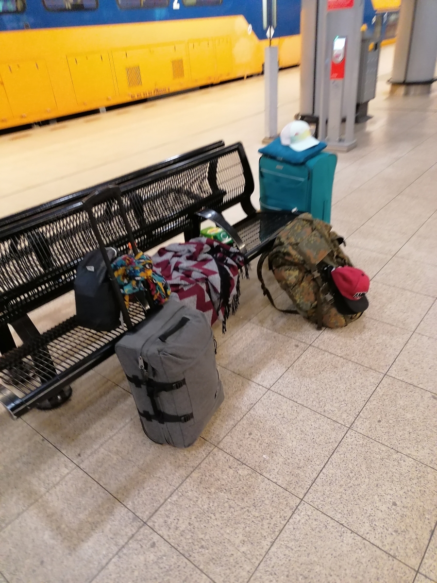 Leider können wir uns die Rennerei um so eine Verwechslung jetzt doch sehr gut vorstellen. Man verlässt den Gepäckbereich, will etwas umpacken und bemerkt eine Verwechslung. Man geht schnell zurück zu den Ankünften, sieht sich dabei panisch um nach jemandem mit dem eigenen Koffer und setzt sich mit der Realität auseinander, dass der jetzt erstmal weg ist. Man findet – natürlich – niemanden. Man spricht Personal an, um Hilfe zu bekommen. Man teilt sich auf, eine sucht ne offizielle Anlaufstelle für solche Probleme (Überraschung, sehr schwer zu finden) der andere rennt mit der falschen Tasche zu den Zügen in der Hoffnung den Verwechsler noch am Gleis zu finden (ohne Erfolg versteht sich). Man telefoniert in der Folge mit verschiedenen Kundendiensten – findet nur wegen dieser Telefonate die mysteriöse Tür Nr. 16 (Gepäck-Verlust-Anzeige oder so) und darf deshalb nochmal zurück zu den Gepäckbändern. Dort ist natürlich niemand ansprechbar oder zuständig und erst nachdem eine Mitarbeiterin einer anderen Airline freundlicherweise ne Kollegin angerufen hat, wird man zu einem Büro am anderen Ende des Ankunftsbereichs geschickt, wo ein entspannter Holländer ne Gepäckverlust-Anzeige aufnimmt. Das Ganze dauert so knapp zwei Stunden, die Tasche is trotzdem weg und ne Garantie, dass die wieder auftaucht gibt es selbstverständlich nicht. Bombe. Dann mal auf zu den Gleisen und auf den Zug warten.