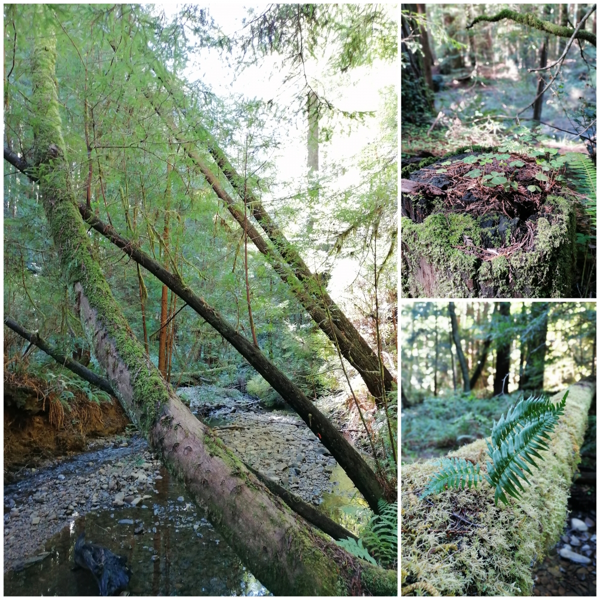 Der PCH brachte uns vom Ozean weg und wurde dann vom Highway 1 zur 101, was andeutete, dass es erstmal etwas weniger Seeblicke geben würde. Stattdessen kamen wir in dicke feuchte Wälder voller Farne und ziemlich großer Bäume. Relativ schnell beschlossen wir mal einen Stopp einzulegen um ein paar Eindrücke auch auf Bildern festhalten zu können. Es sah ein bisschen aus, wie bei Jurrasic Park. Farne in jeder Lücke, alle Bäume und Stümpfe üppig bewachsen, vielleicht etwas weniger junglig. Ein toller Wald, der das ozeanische Klima und die zugehörige Nässe optimal auszunutzen scheint. Wir entdeckten auch ein paar massive Baumstümpfe, die deutlich größer waren als alle umstehenden Bäume. Das mussten mal richtige Giganten gewesen sein. Ein bisschen entschädigte uns das dafür, nicht zu den Riesen-Bäumen im Sequoia Natl. Park gekommen zu sein – dachten wir zumindest. Was kurz darauf kam, war nicht geplant und für uns einfach ein riesen Geschenk auf der Tour. Es bot sich die Abzweigung von der 101 auf eine Parallel-Straße mit dem Namen „Avenue of the Giants“ an. Wir dachten uns, da würde es definitiv was zusehen geben, vielleicht ja ein paar mächtige Berge, Brücken oder ein zwei der Bäume, von denen wir nur Stümpfe hatten finden können. Was sich fand? Die Durchfahrt durch den Redwood State Park. Ein State Park, dessen Attraktion Küsten-Mammutbäume – die größten Bäume der Welt – sind. Die Begeisterung packte uns sofort. Wir fuhren weiter und es dauerte nicht lang bis sich Wälder mit absolut atemberaubenden Bäumen vor uns auftaten. Dicht an dicht standen die Giganten bis an die Straße und aus dem Auto konnte man teilweise deren Spitzen auf bis zu 130m(!) Höhe gar nicht erkennen. Wir haben natürlich häufig angehalten, sind umhergesprungen und haben Bilder gemacht und uns die Hälse verrenkt. Die tatsächlichen Ausmaße der bis zu 2000 Jahre alten Bäume waren einmal sehr gut zu erkennen, als wir an einem umgestürzten Exemplar vorbeikamen. Von der Spitze bis zur Wurzel noch ziemlich intakt lag das Ungetüm da und erstreckte sich wirklich ewig über den Waldboden. Natürlich haben wir die Mittagspause auch im Park verbracht (lecker Nudeln gekocht). Wir haben uns danach noch die Zeit genommen, durch den zum Park gehörenden Rockefeller Forest zu fahren – hier stehen 20% aller Küsten-Mammutbäume die es noch gibt. Herrlich, wenn einem die Reisepläne so durcheinander gebracht werden. Wir haben dabei zwei wichtige Dinge gelernt: unsere freiere Zeitplanung ist vielleicht gerade jetzt der bessere Plan und die Küsten-Mammutbäume sind höher, als die im Sequoia Natl. Park 😉