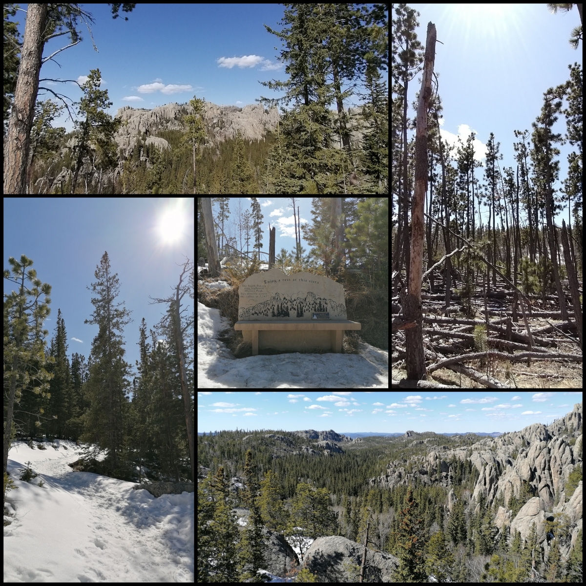 Pausiert war dann genug und es ging auf zum zweiten Gipfel, dem Black Elk Peak. Der Weg dorthin war wegen der halb angefrorenen, halb tauenden Schneedecke herausfordernd, aber zumindest die ganze Zeit wirklich schön. Hoch geschafft haben wir es dann auch und hatten damit den höchsten Gipfel nicht nur östlich der Rockies, sondern auch westlich der Pyrenäen (laut Infotafel) erreicht. Das Gipfelbierchen hatten wir uns damit verdient und auch hier oben ergab sich mit einem anderen Wanderer ein netter kleiner Schwatz. Keine hilfreichen Tipps diesmal, nur ein bisschen Football-Talk. Das tut ehrlich gesagt auch mal echt gut. Wir haben ja momentan, außer miteinander, meist nur Service-Kontakte. Da is so ein Plausch, auch auf 2207m Höhe, ne feine Sache.