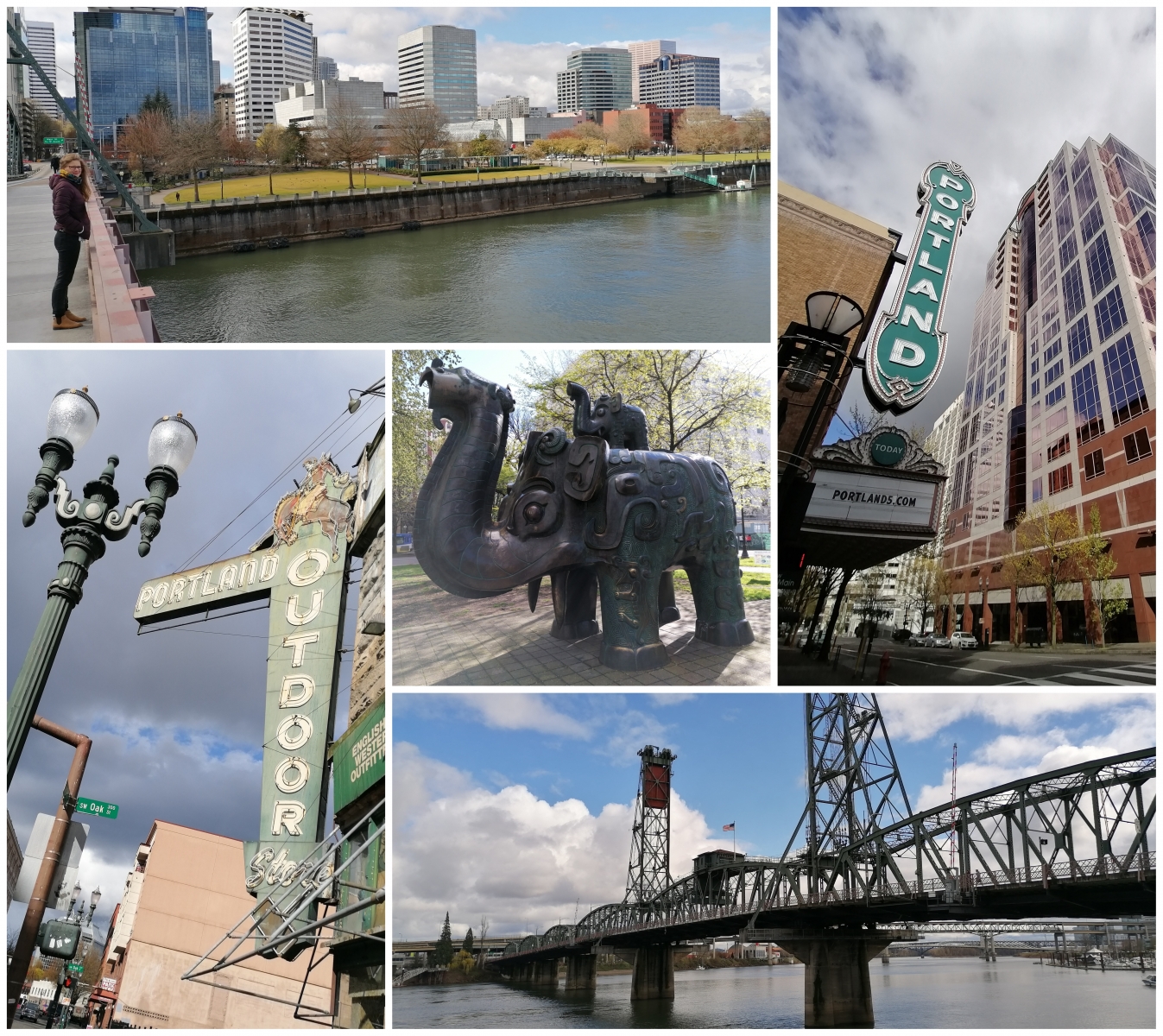 Unser Hotel hatte eine perfekte Lage, so dass wir die erste Tour zu Fuß machen konnten. Natürlich hatte in der Innenstadt fast alles geschlossen, aber davon ließen wir uns nicht aufhalten. Dann ist eben der Chinesische Garten geschlossen und der Springbrunnen im Keller Park trocken. Dennoch hatten wir einen tollen Spaziergang durch Old Town und Downtown Portland. Überall sind tolle alte Metallschilder zu finden, die meiner Meinung nach vorrangig die Stadt auszeichnen. Vorbei am Dante’s Inferno mit dem berühmten „Keep Portland Weird“-Wandbild und dem Must-See am Flussende von Old Town, dem „White Stag Sign“, stießen wir auf den Japanese American Historical Plaza. Dort gibt es eine Allee voller Kirschbäume, die auch im leicht verblühten Zustand einen gewissen Charme abgaben. Zwischen der Burnside Bridge und der Hawthorne Bridge folgten wir dem Waterfront Park Trail und suchten während dessen nach dem kleinsten Park der Welt. Der war wirklich nicht leicht zu finden. Doch wir haben nicht aufgegeben ;-). Ab dann drehten wir dem Fluss den Rücken zu und gingen Richtung Downtwon zum Keller Fountain Park und der Arlene Schnitzer Music Hall.