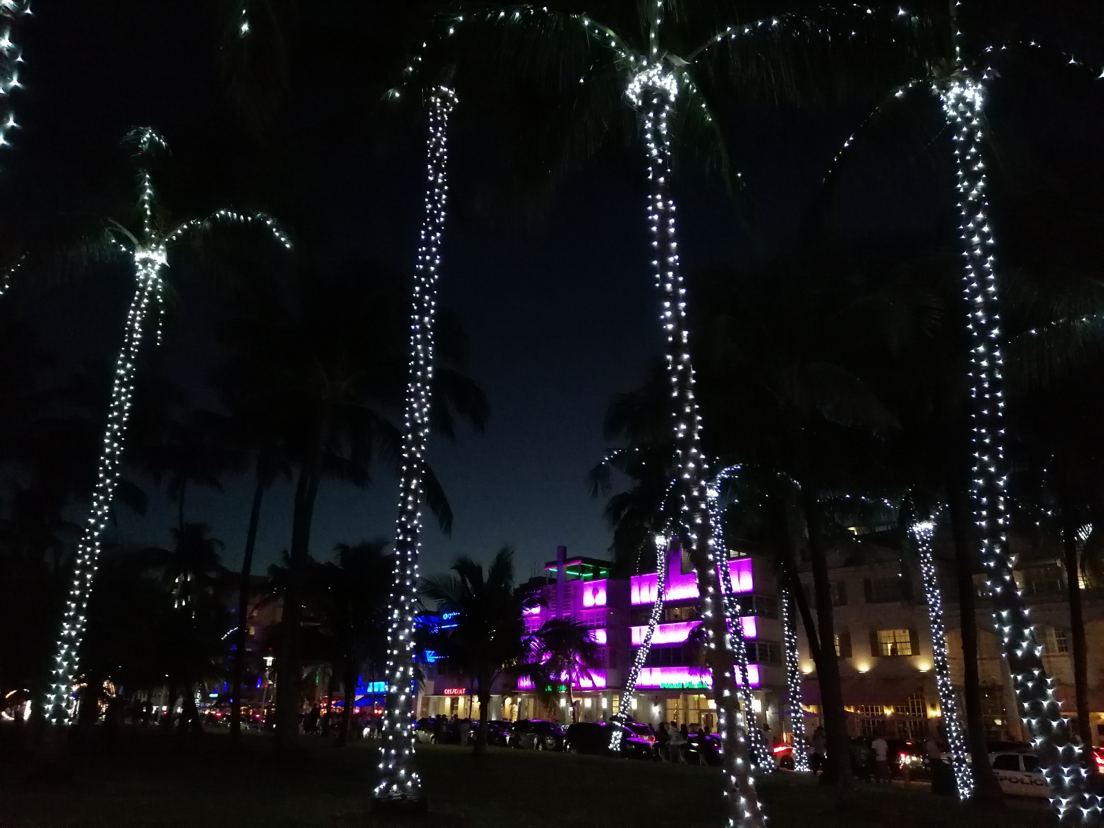 Irgendwie ist Miami Beach dann doch nicht so klein wie gedacht und wir sind bei feinstem Sonnenschein und 25° fröhlich die gesamte Insel entlang marschiert. Mal am strandnahen Boardwalk, mal entlang der Hauptstraßen direkt am Kanal (Yachten…Villen…Neid?!). Nach dem Jogging am Tag zuvor war die Tour nicht ganz ohne, aber die Ankunft am Ocean Drive und dem zugehörigen Strandabschnitt noch vor Sonnenuntergang war genau passend. Mit der sinkenden Sonne gingen die Neonlichter an. Ein wirklich toller Anblick jedes Haus am „Strip“ – ob Bar, Hotel, Restaurant oder Club – aufwändig und bunt beleuchtet um die verschiedenen Fassaden zu betonen. Und als kleine Zugabe noch die Weihnachtsdeko aus den Feiertagen an den Palmen und auf den Grünflächen. Die Bilder lassen es ja erahnen, uns hat’s gefallen. Während wir uns langsam satt sahen drängte sich bei uns beiden so eine Frage auf: Müssen wir jetzt die ganze Strecke wieder zurück laufen? Ohne größere Beratung kamen wir zum klarsten „Nein“ des Tages. Stattdessen haben wir den eigentlich in den Staaten so verpönten Öffis ne Chance gegeben. Und siehe da: ein lustiger Retro-Shuttle-Bus nahm uns fast bis zum Auto die gesamte Insel herauf wieder mit in den Norden. Kostenpunkt: 0. Was kann man mehr wollen? Heimfahrt, duschen, Abendessen, Feierabend.