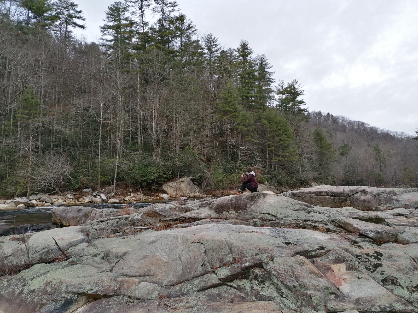Eine sehr ruhige Nacht endete erholsam, als das Auto langsam vom Morgenlicht beleuchtet wurde. Zähne geputzt und einen Spritzer kaltes Wasser aus dem nahe gelegenen Bach und dann wollten wir die Gegend in der wir geschlafen hatten bei Licht und mit Zeit ein wenig erkunden. Der Teil des Pisgah National Forest, in dem wir uns befanden hieß Wilsons Creek Gorge. Den namensgebenden Bach hatten wir die ganze Zeit an unserer Seite und er schlängelte sich mal steiler und mal flacher, aber stets höchst fotogen durch die Schlucht. auf einem der Felsen im Bach hatte Tina dann ihr Frühstück und ich war glücklich die ganze Zeit rumkraxeln und -klettern zu können.