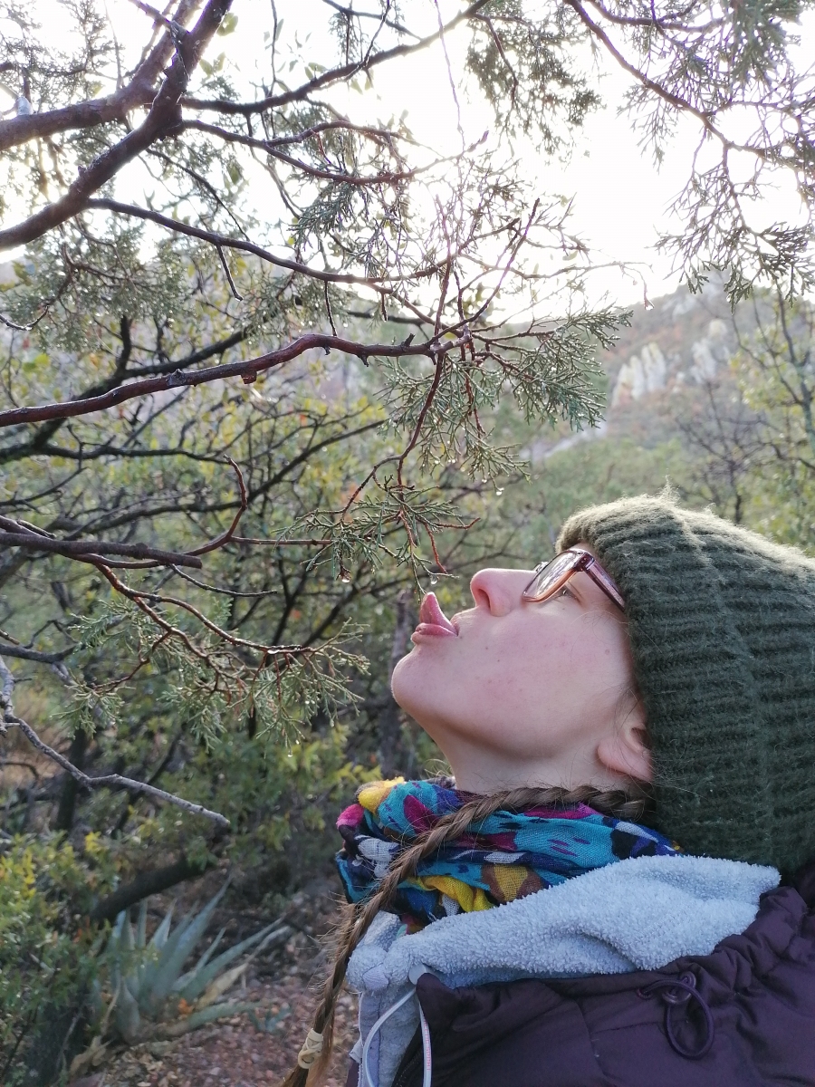 Nach dem Mittag machten wir uns auf den Weg ohne richtiges Ziel. Es war so gegen 13 Uhr. Wir wussten nur, dass wir gegen 16 Uhr wieder zurück sein mussten um noch genug Zeit zu haben, das Feuer für den Abend anzubekommen. Schließlich war das ganze rumliegende Holz nicht wirklich trocken. Also gingen wir erstmal los und wussten, dass wir zur Not nach 1,5h einfach wieder rumdrehen müssen. Es war warm, entspannend und lief nicht ganz ohne Hindernisse ab. Die Wege waren nicht gut zu erkennen und die Wegweiser nicht einfach zu entdecken. Wir folgten dem auffälligsten der Wege und waren gespannt, wo er uns hinführt. Eine Zeit lang begleiteten uns Fußspuren von einem (bzw. 2) hundeähnlichen Tier(-en) – Coyoten? Und kleine Naturschönheiten waren auch zu entdecken. Nach der Halbzeit kamen wir an einem einsam stehenden Haus an. Da wir nicht genau wussten, wo wir waren und uns nicht entscheiden konnten, welche Richtung der Straße wir gehen müssten, sind wir wieder umgedreht. Das letzte Stück haben wir dann etwas abgekürzt, weil wir einen Wegweiser entdeckt hatten, an den wir uns noch erinnern konnten. Es war nicht der einfachste Weg mit all den Stachelsträuchern, umgefallenen Bäumen und rutschigen Steinen entlang einem ausgetrockneten Bergbach. Aber es war der Interessantere. Pünktlich kurz vor 4 waren wir nach 9 km wieder im Camp angekommen. Da wir nur noch 1h Zeit hatten, bevor es dunkel wurde, kümmerten wir uns sofort ums Feuer. Mit der Hilfe von jeder Menge zur Verfügung stehendem Klopapier und einigem trockenen, gekauften Holz haben wir es mit viel Pusten hinbekommen. Das Licht für den Abend war somit auch gesichert.