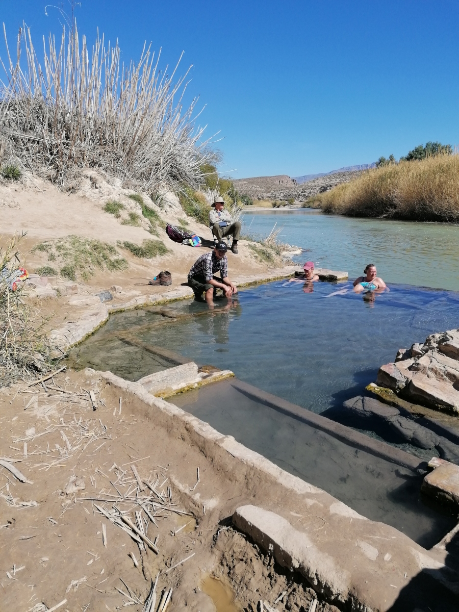 Der Pine Canyon ist nur auf einer unbefestigten Sandstraße zu erreichen. Hier gibt es keine entwickelten Campingplätze, sondern nur Schotterflächen mit Bärenboxen. Ja hier im Big Bend gibt es (Schwarz-)Bären, Pumas und Javelinas, die auf unser Essen (oder uns?) abfahren könnten. Da es auch keine Toiletten gab, wurde uns (mir sogar das erste Mal) erklärt, wie und wo man sein großes Geschäft verbuddeln soll – dig a nice deep hole a couple of meters away. Jaaa, das haben wir uns dann mal verkniffen… Die Sonne brannte. Es wehte kein Lüftchen. Und es gab keine Bäume um unsere Plane zu befestigen. Mit einer kleiner Notlösung haben wir immerhin 2m² Schatten kreieren können. Dann hat erstmal jeder sein Ding gemacht. Paul wollte natürlich auf den Berg hinter uns um einen besseren Ausblick zu gewinnen. Ich habe mir eine meditationsähnliche Pause gegönnt um die Umgebung besser wahrzunehmen. Dazu kann ich sagen, dass es sehr leise war. Es gab fast keine Geräusche, sodass der Flügelschlag der Vögel sogar herausstach. Neben Fliegensurren und dem Rascheln von Pauls Bergkraxeln, gab es nichts als Stille. Wahnsinn!