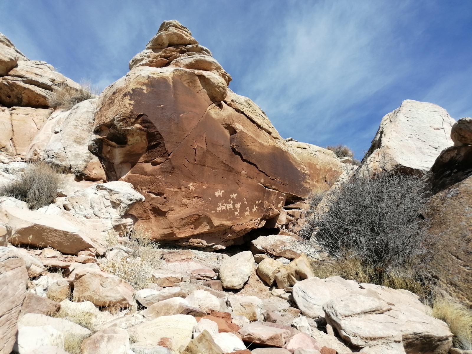 Anstehen musste man zwar noch nicht, aber ein bisschen gegenseitige Rücksichtnahme war schon angebracht. Für die Kinder war das Runterkommen kein Problem, aber die Eltern dazu brauchten ihre Zeit. Dann durften wir mittendrin stehen. Es war zauberhaft. Was wir uns natürlich auch nicht entgehen lassen wollten, ist der erwähnte Instagram Arch. Da der eigentliche Weg dahin nicht in unsere Tagesplanung gepasst hatte, haben wir ihn einfach von der anderen Seite bestaunt (und ein paar übrig gebliebene Petroglyphen gab es auf dem Weg on top). Ich weiß nicht genau, ob man es auf dem Bild erkennen kann, aber dort muss man wirklich anstehen um ein Bild zu schießen. Auf dem Weg zum Sand Dune Arch kamen wir an einer großen, flachen Ebene (Salt Valley) vorbei. Dort lernten wir, dass da ebenfalls mal ein Ozean war (derselbe wie im Big Bend?) und unterhalb der Erdoberfläche eine sehr dicke Salzschicht verborgen liegt. Daher heißt auch der dazugehörige kleine Fluss Salt Wash Creek. Ob das Wasser darin wirklich salzig ist, konnten wir leider nicht überprüfen. Aber die ganze Landschaft hatte einen grünen Schein, der beim Wandern sogar auf uns reflektierte und uns nen ungewöhnlichen Teint anfärbte. Der Sand Dune Arch war wieder ganz anders anzusehen. Er war etwas versteckt in einer Felsspalte. Zu dieser Tageszeit war es ziemlich warm geworden. Doch einmal durch die Spalte gegangen, wurde es plötzlich sehr kühl. Der Sand war feucht und dort kommt wohl eher kein Sonnenstrahl hin. Danach gab es für uns nicht mehr viel abzuarbeiten. Wir hielten dann noch an 2 weiteren Arches und einer Steinkombination namens Fiery Furnance. Diese Stopps lagen auch schon in der Richtung, in der wir den Park auch verlassen wollten. Es war eine holprige Backcountry Straße, auf der vorstellbarerweise nicht viel Verkehr war. Aber ich hatte viel Spaß dabei, ne Stunde lang so den Park durch das Salt Valley verlassen zu können.