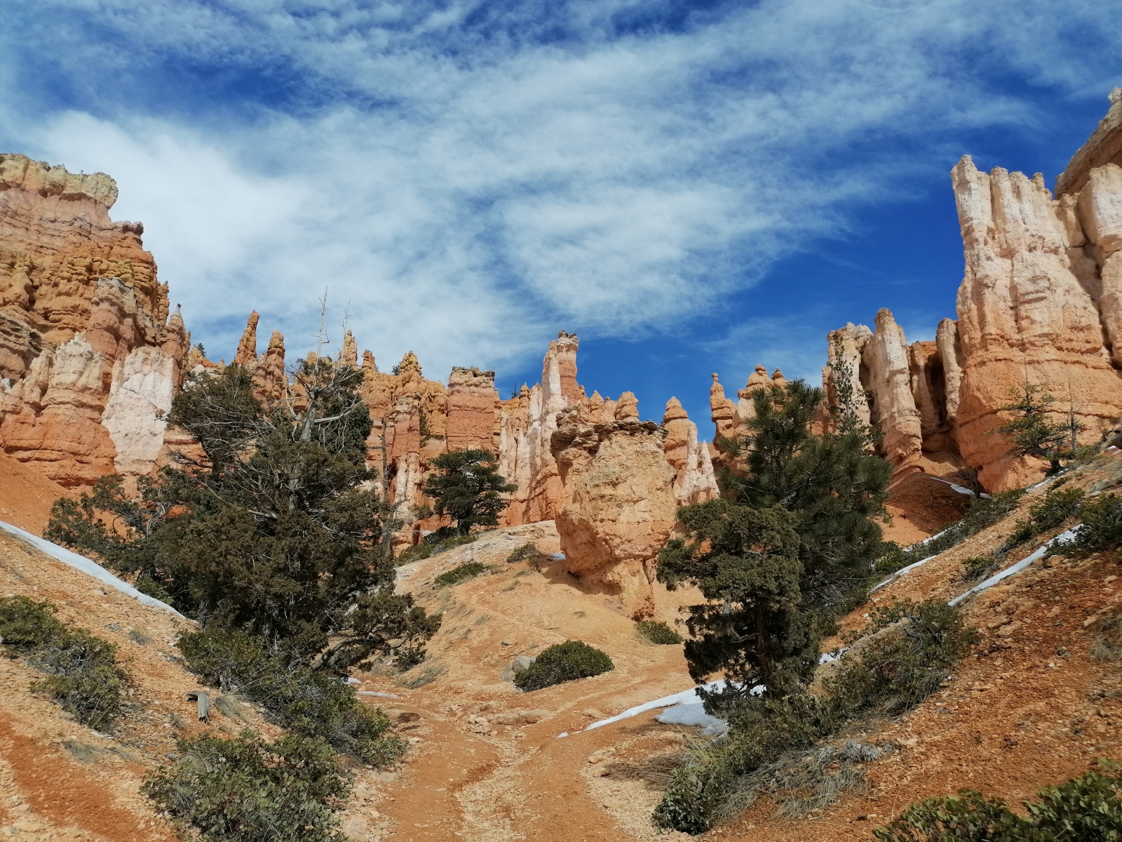 Wie am Tag zuvor machten wir uns recht zeitig aus Salina auf zum Bryce Canyon National Park. Die Fahrt dauerte etwa 2h. Das Wetter war hervorragend und die Hauptattraktion, das Amphietheatre, war fesselnd. Es besteht aus unzähligen Hoodoos, die nach einer Legende auf einer Infotafel, gottähnliche Menschen in Tiergestalt waren, die aber von einem Kojoten aus Sicherheitsgründen versteinert wurden und nun für immer und ewig (oder zumindest solange es die Witterung zulässt) hintereinander, recht gut geordnet da stehen. Bei Sonnenschein erscheinen sie in einem leuchtenden orange und der Schnee stellt einen traumhaften Kontrast zwischen den Felsen und den Bäumen her. Wunderschön anzusehen. Uns war somit klar, dass wir den Wanderweg entlang des Amphietheaters gehen würden. Es lag tatsächlich noch jede Menge Schnee, aber es war auch Tauwetter. Also hatten wir mit dem Sand, Matsch und eisigen Partien diverse Wanderbedingungen.