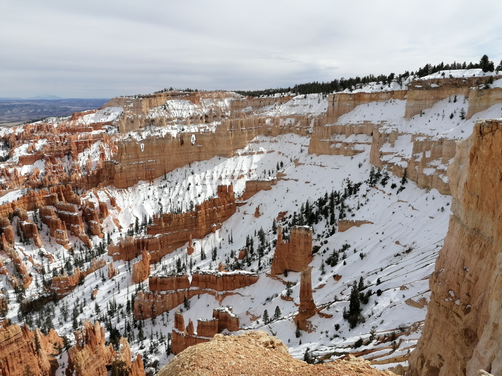 Wie am Tag zuvor machten wir uns recht zeitig aus Salina auf zum Bryce Canyon National Park. Die Fahrt dauerte etwa 2h. Das Wetter war hervorragend und die Hauptattraktion, das Amphietheatre, war fesselnd. Es besteht aus unzähligen Hoodoos, die nach einer Legende auf einer Infotafel, gottähnliche Menschen in Tiergestalt waren, die aber von einem Kojoten aus Sicherheitsgründen versteinert wurden und nun für immer und ewig (oder zumindest solange es die Witterung zulässt) hintereinander, recht gut geordnet da stehen. Bei Sonnenschein erscheinen sie in einem leuchtenden orange und der Schnee stellt einen traumhaften Kontrast zwischen den Felsen und den Bäumen her. Wunderschön anzusehen. Uns war somit klar, dass wir den Wanderweg entlang des Amphietheaters gehen würden. Es lag tatsächlich noch jede Menge Schnee, aber es war auch Tauwetter. Also hatten wir mit dem Sand, Matsch und eisigen Partien diverse Wanderbedingungen.