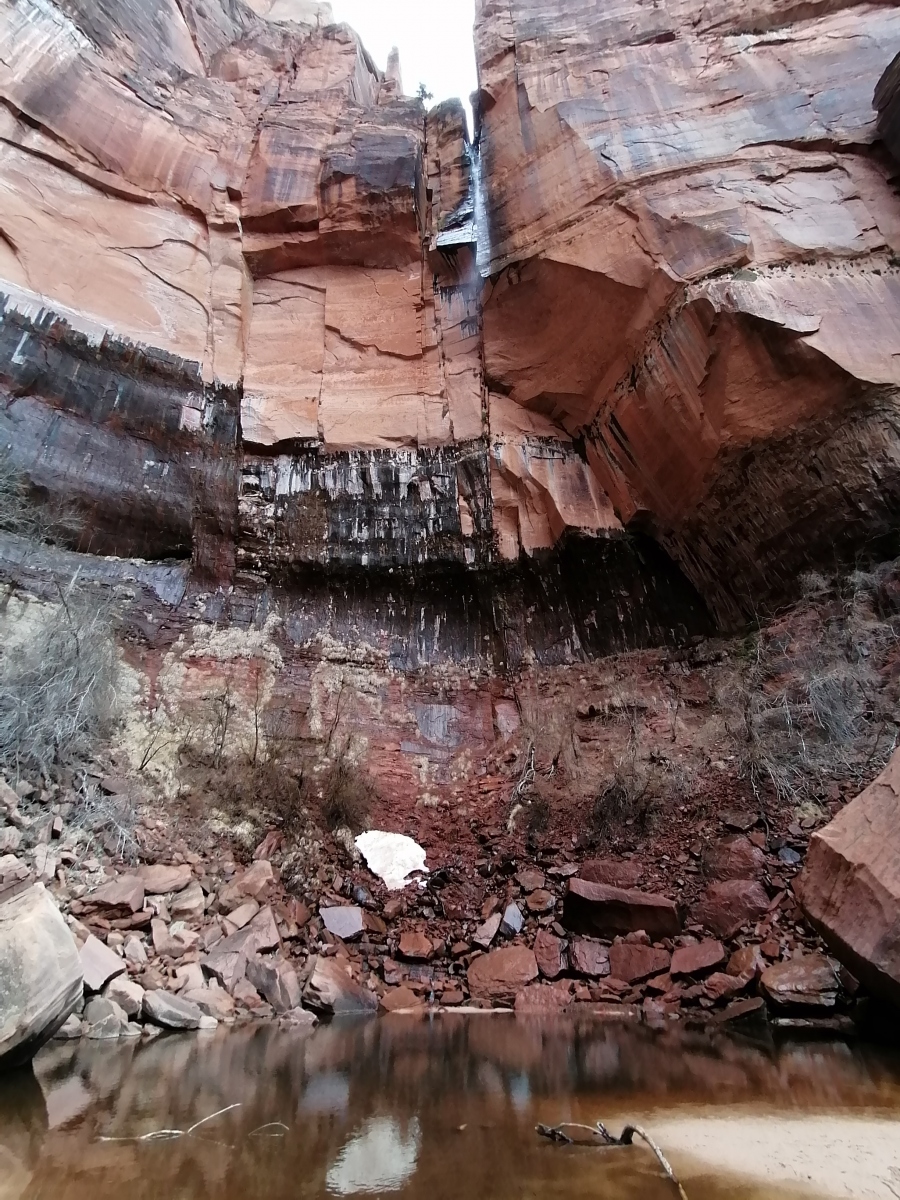 Und dann ging es los zur Bushaltestelle. Wir haben uns mithilfe der Infokarte 2 Wege rausgesucht, die wir an diesem Tag schaffen wollten. Zuerst kam der relativ kurze Riverwalk, aber der war für seine Kürze wunderschön. Das Wasser war super klar, es plätscherte, auf der anderen Uferseite sahen wir eine Rehfamilie und alle anderen Leute haben sich für den parallel laufenden Weg entschieden. Dieser führte an den Anfang eines Wanderweges, den man komplett durchs Wasser beschreitet. Im Bus hatten wir Leute gesehen, die definitiv dieses kleine Abenteuer geplant hatten. Denn sie waren voll ausgestattet mit wasserfesten Klamotten, die sie mit Sicherheit im Park ausgeliehen hatten. Aber es sind uns auch Wanderer entgegen gekommen, die zumindest ein Stück nur mit ihren Turnschuhen gelaufen sind. Ich glaube nicht, dass sie weit gekommen sind bei all den Steinen im Fluss. Und kalt war es auch. Für uns war das ein guter Anfang. Jedoch dachten wir zu dieser Zeit dann, dass nur noch ein Trail zeitlich zu machen ist. Einer der Shuttle-Bus-Fahrer hatte dann auch etwas von nem „einzigartigen“ und „super-steilen“ Trail erzählt. Somit wollten wir dann diesen berühmten Weg – „Angels Landing“ – als Tagesabschluss angehen. Also ab in den Bus und zur richtigen Haltestelle fahren, damit es ganz schnell losgehen kann. Wir liefen und liefen auf dem Trail, bis wir an einem sehr menschengefüllten Platz ankamen – Middle Emerald Pool. Da hat es dann Klick gemacht. Wir waren auf dem falschen Weg gelandet. Diesen wollten wir nur machen, wenn wir noch genug Zeit vorm Sonnenuntergang haben sollten. Doch dann war es auch egal und wir sind noch zum Upper Emerald Pool, da wir eh schon fast da waren. Es hat sich gelohnt und wir konnten absolut verstehen, warum dort nochmal ausdrücklich verboten wurde schwimmen zu gehen. Einmal dort unter dem zarten Wasserfall ne kleine Dusche nehmen, ist definitiv verlockend. Gut, der Rückweg zum eigentlich gewünschten Angels Landing Trail ging dann sehr schnell. Und dann kam der Knaller. Ein gutes Stück Serpentinen, deren Steigung nicht ohne waren, lag vor uns. Aber gut aufgewärmt war das mit 2-3 kleinen Verschnaufpausen kein Problem. Als wir oben angekommen sind, war es aber noch nicht zu ende, wie vermutet. Es ging noch weiter…und wie. Steil, an einer Kette, teilweise links und rechts Abgrund. Auf den ersten Anblick, waren wir erstmal etwas geschockt, dass das tatsächlich erlaubt sein soll (Einfach mal Angels Landing Trail bei Youtube suchen – Liebe Eltern, Ihr wollt das eventuell nicht sehen.). Doch als wir gesehen hatten, wer mit welchem Schuhwerk dort so entlang geklettert, fühlten wir uns auf der sicheren Seite. Schritt für Schritt ging es immer höher immer entlang der Kette, die von uns nicht einmal losgelassen wurde. Es war einfach der Wahnsinn. Schritt für Schritt immer weiter…bis ich langsam zittrige Knie und ein flaues Gefühl im Magen bekam. An einer Stelle mit einem wunderschönen Ausblick war ich dann zufrieden und entschied, dort zu bleiben. Man muss ja seine Grenzen kennen. Paul ging noch weiter, ich habe dort, wo ich war, einfach gewartet.