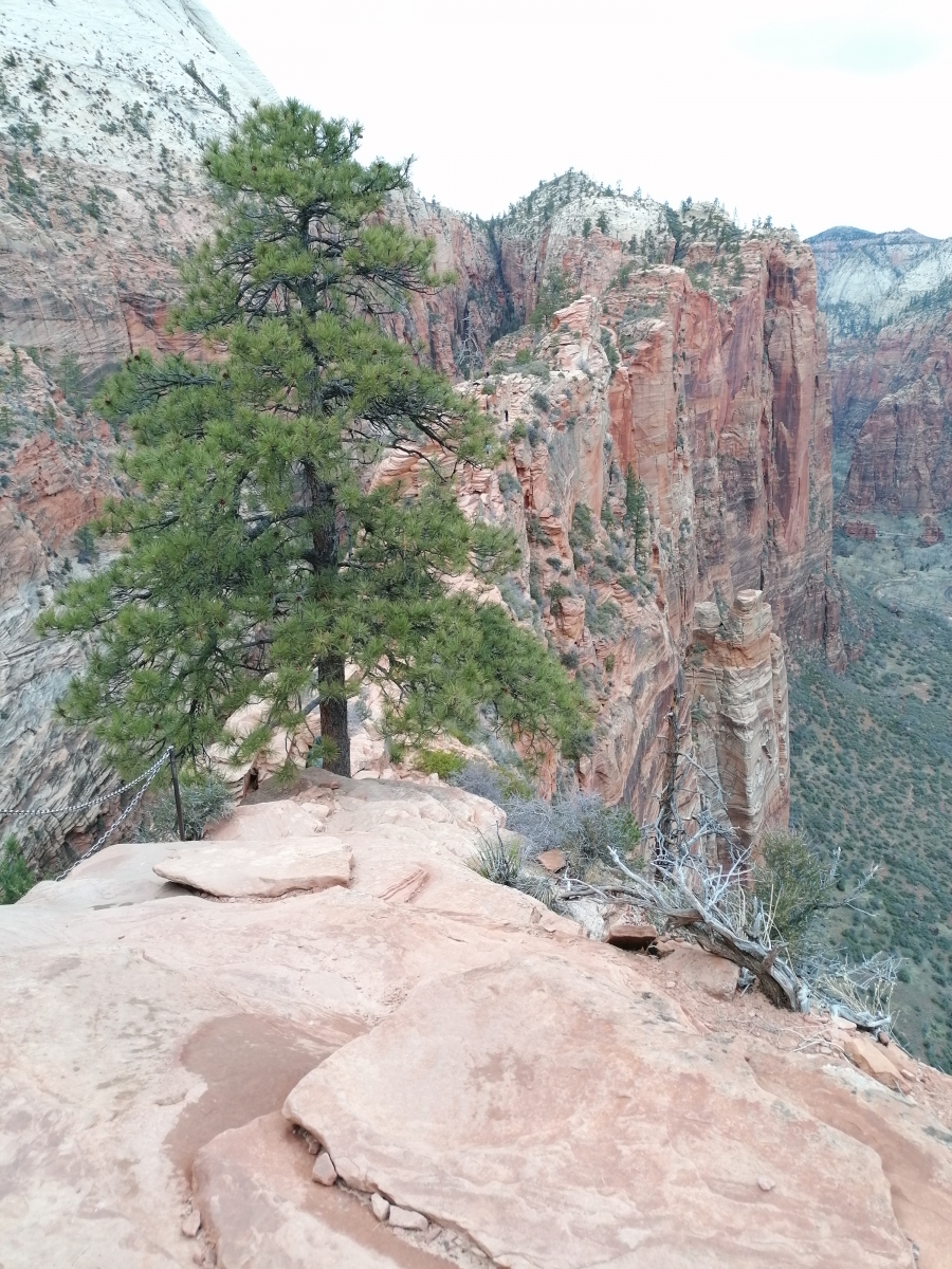 Und dann ging es los zur Bushaltestelle. Wir haben uns mithilfe der Infokarte 2 Wege rausgesucht, die wir an diesem Tag schaffen wollten. Zuerst kam der relativ kurze Riverwalk, aber der war für seine Kürze wunderschön. Das Wasser war super klar, es plätscherte, auf der anderen Uferseite sahen wir eine Rehfamilie und alle anderen Leute haben sich für den parallel laufenden Weg entschieden. Dieser führte an den Anfang eines Wanderweges, den man komplett durchs Wasser beschreitet. Im Bus hatten wir Leute gesehen, die definitiv dieses kleine Abenteuer geplant hatten. Denn sie waren voll ausgestattet mit wasserfesten Klamotten, die sie mit Sicherheit im Park ausgeliehen hatten. Aber es sind uns auch Wanderer entgegen gekommen, die zumindest ein Stück nur mit ihren Turnschuhen gelaufen sind. Ich glaube nicht, dass sie weit gekommen sind bei all den Steinen im Fluss. Und kalt war es auch. Für uns war das ein guter Anfang. Jedoch dachten wir zu dieser Zeit dann, dass nur noch ein Trail zeitlich zu machen ist. Einer der Shuttle-Bus-Fahrer hatte dann auch etwas von nem „einzigartigen“ und „super-steilen“ Trail erzählt. Somit wollten wir dann diesen berühmten Weg – „Angels Landing“ – als Tagesabschluss angehen. Also ab in den Bus und zur richtigen Haltestelle fahren, damit es ganz schnell losgehen kann. Wir liefen und liefen auf dem Trail, bis wir an einem sehr menschengefüllten Platz ankamen – Middle Emerald Pool. Da hat es dann Klick gemacht. Wir waren auf dem falschen Weg gelandet. Diesen wollten wir nur machen, wenn wir noch genug Zeit vorm Sonnenuntergang haben sollten. Doch dann war es auch egal und wir sind noch zum Upper Emerald Pool, da wir eh schon fast da waren. Es hat sich gelohnt und wir konnten absolut verstehen, warum dort nochmal ausdrücklich verboten wurde schwimmen zu gehen. Einmal dort unter dem zarten Wasserfall ne kleine Dusche nehmen, ist definitiv verlockend. Gut, der Rückweg zum eigentlich gewünschten Angels Landing Trail ging dann sehr schnell. Und dann kam der Knaller. Ein gutes Stück Serpentinen, deren Steigung nicht ohne waren, lag vor uns. Aber gut aufgewärmt war das mit 2-3 kleinen Verschnaufpausen kein Problem. Als wir oben angekommen sind, war es aber noch nicht zu ende, wie vermutet. Es ging noch weiter…und wie. Steil, an einer Kette, teilweise links und rechts Abgrund. Auf den ersten Anblick, waren wir erstmal etwas geschockt, dass das tatsächlich erlaubt sein soll (Einfach mal Angels Landing Trail bei Youtube suchen – Liebe Eltern, Ihr wollt das eventuell nicht sehen.). Doch als wir gesehen hatten, wer mit welchem Schuhwerk dort so entlang geklettert, fühlten wir uns auf der sicheren Seite. Schritt für Schritt ging es immer höher immer entlang der Kette, die von uns nicht einmal losgelassen wurde. Es war einfach der Wahnsinn. Schritt für Schritt immer weiter…bis ich langsam zittrige Knie und ein flaues Gefühl im Magen bekam. An einer Stelle mit einem wunderschönen Ausblick war ich dann zufrieden und entschied, dort zu bleiben. Man muss ja seine Grenzen kennen. Paul ging noch weiter, ich habe dort, wo ich war, einfach gewartet.