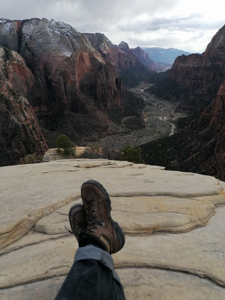 Also „Wahnsinn“ wurde auf dem Weg ein bisschen unser Mantra. Nicht immer im atemberaubend-begeisterten Sinn, sondern auch wegen des empfundenen Risikos. Wenige Fuß entfernt von nem steilen Abgrund entlang wandern, nur gesichert durch die eigene Hand an einem Stahlseil? Klar is das spannend aber auch in Deutschland (aus gutem Grund) nie vorstellbar. Ich hatte vorher nur ein Bild dieses Teils des Trails gesehen und nahm an, das könne nur ein kurzes Stück sein und auf Fotos können Sachen ja auch gerne mal dramatischer aussehen. Als die ersten Absteiger dann aber meinten „nur noch“ 30-45 Minuten?! Und es war nicht übertrieben. Zusammen sind wir sicher gut 25 Minuten aufgestiegen. Mit ordentlich Adrenalin im Blut und ständig auf Sicherheit bedacht. Als Tina dann kein gutes Gefühl mehr hatte, konnte ich das gut verstehen. Aber gleichzeitig:so weit kommen und nicht den Gipfel sehen? Wir haben uns kurz beraten und ich bin dann weiter. Nochmal ca. 10 Minuten steil den Grat bergauf. Dann fast oben angekommen geht man auf dem schmalen Rücken des Berges (jetzt ganz ohne Sicherung) zu einer Plattform von ca. 6×6 Metern (auch ohne Sicherheitsgeländer) und BAM – Gipfel. Was ein Ausblick in den Zion Canyon – Wahnsinn. Das dort oben unter anderem eine 7-köpfige Familie mit Kindern zwischen geschätzt 10 und 17 rumfotografierte war dann wieder der andere „Wahnsinn“. Ich empfand das Ganze nicht als ein kinderfreundliches Abenteuer – aber wenn man 5 Küken hat, ist Schwund vielleicht zu verkraften. Egal, Kinnlade aufgesammelt, Bilder geknipst und dann vorsichtig und sicheren Fußes zurück zu Tina und den Abstieg angegangen.
