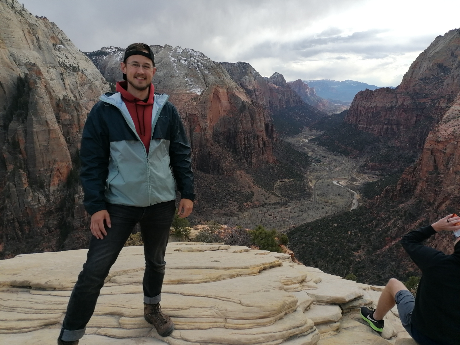 Und dann ging es los zur Bushaltestelle. Wir haben uns mithilfe der Infokarte 2 Wege rausgesucht, die wir an diesem Tag schaffen wollten. Zuerst kam der relativ kurze Riverwalk, aber der war für seine Kürze wunderschön. Das Wasser war super klar, es plätscherte, auf der anderen Uferseite sahen wir eine Rehfamilie und alle anderen Leute haben sich für den parallel laufenden Weg entschieden. Dieser führte an den Anfang eines Wanderweges, den man komplett durchs Wasser beschreitet. Im Bus hatten wir Leute gesehen, die definitiv dieses kleine Abenteuer geplant hatten. Denn sie waren voll ausgestattet mit wasserfesten Klamotten, die sie mit Sicherheit im Park ausgeliehen hatten. Aber es sind uns auch Wanderer entgegen gekommen, die zumindest ein Stück nur mit ihren Turnschuhen gelaufen sind. Ich glaube nicht, dass sie weit gekommen sind bei all den Steinen im Fluss. Und kalt war es auch. Für uns war das ein guter Anfang. Jedoch dachten wir zu dieser Zeit dann, dass nur noch ein Trail zeitlich zu machen ist. Einer der Shuttle-Bus-Fahrer hatte dann auch etwas von nem „einzigartigen“ und „super-steilen“ Trail erzählt. Somit wollten wir dann diesen berühmten Weg – „Angels Landing“ – als Tagesabschluss angehen. Also ab in den Bus und zur richtigen Haltestelle fahren, damit es ganz schnell losgehen kann. Wir liefen und liefen auf dem Trail, bis wir an einem sehr menschengefüllten Platz ankamen – Middle Emerald Pool. Da hat es dann Klick gemacht. Wir waren auf dem falschen Weg gelandet. Diesen wollten wir nur machen, wenn wir noch genug Zeit vorm Sonnenuntergang haben sollten. Doch dann war es auch egal und wir sind noch zum Upper Emerald Pool, da wir eh schon fast da waren. Es hat sich gelohnt und wir konnten absolut verstehen, warum dort nochmal ausdrücklich verboten wurde schwimmen zu gehen. Einmal dort unter dem zarten Wasserfall ne kleine Dusche nehmen, ist definitiv verlockend. Gut, der Rückweg zum eigentlich gewünschten Angels Landing Trail ging dann sehr schnell. Und dann kam der Knaller. Ein gutes Stück Serpentinen, deren Steigung nicht ohne waren, lag vor uns. Aber gut aufgewärmt war das mit 2-3 kleinen Verschnaufpausen kein Problem. Als wir oben angekommen sind, war es aber noch nicht zu ende, wie vermutet. Es ging noch weiter…und wie. Steil, an einer Kette, teilweise links und rechts Abgrund. Auf den ersten Anblick, waren wir erstmal etwas geschockt, dass das tatsächlich erlaubt sein soll (Einfach mal Angels Landing Trail bei Youtube suchen – Liebe Eltern, Ihr wollt das eventuell nicht sehen.). Doch als wir gesehen hatten, wer mit welchem Schuhwerk dort so entlang geklettert, fühlten wir uns auf der sicheren Seite. Schritt für Schritt ging es immer höher immer entlang der Kette, die von uns nicht einmal losgelassen wurde. Es war einfach der Wahnsinn. Schritt für Schritt immer weiter…bis ich langsam zittrige Knie und ein flaues Gefühl im Magen bekam. An einer Stelle mit einem wunderschönen Ausblick war ich dann zufrieden und entschied, dort zu bleiben. Man muss ja seine Grenzen kennen. Paul ging noch weiter, ich habe dort, wo ich war, einfach gewartet.