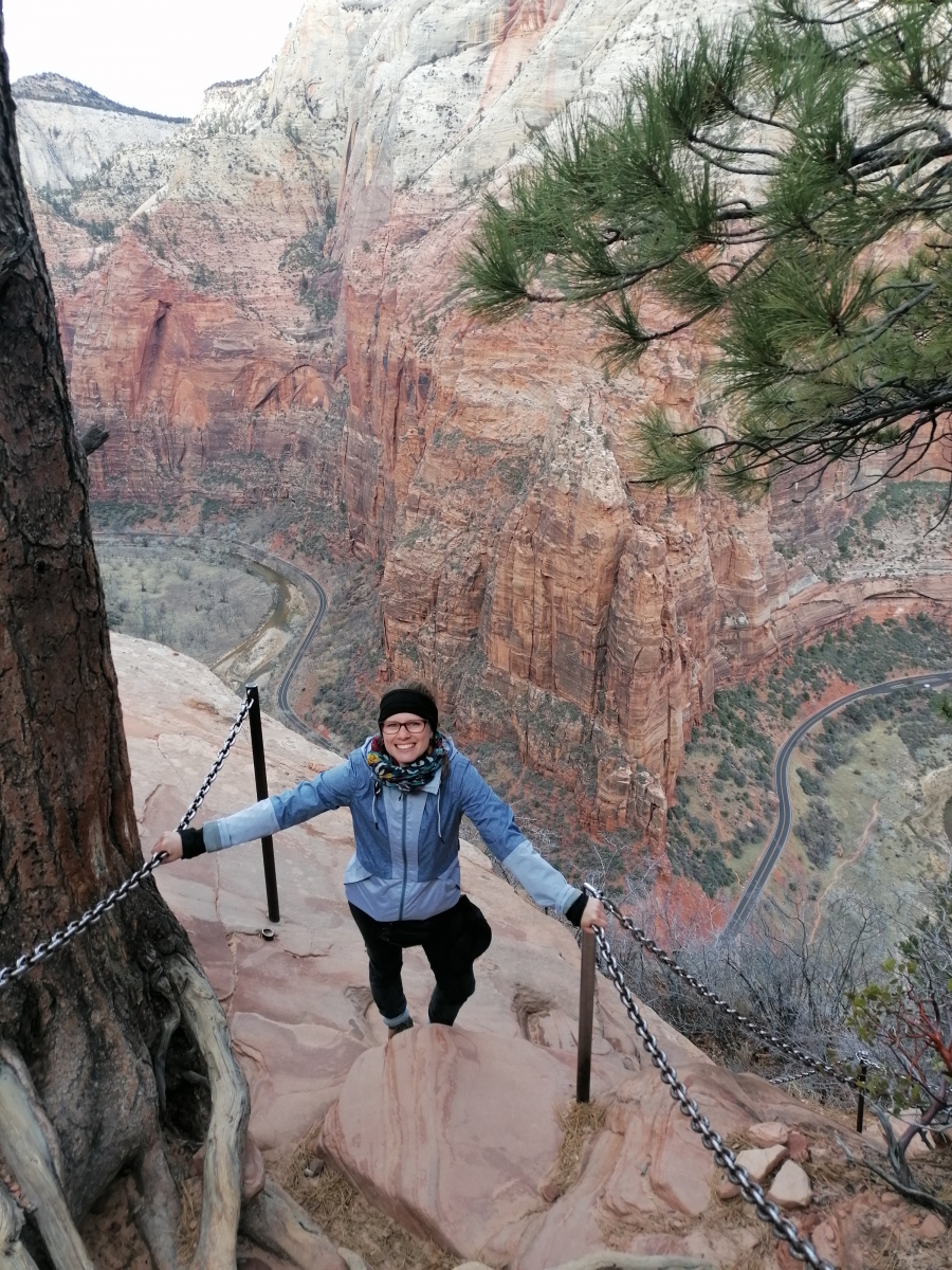 Da der Park diesmal nicht weit weg lag, hatten wir jede Menge Zeit für unser Inklusivfrühstück mit Kakao und Waffeln und Erdnussbutter-Toast. Natürlich auch alles zum Mitnehmen ;-). Gestärkt machten wir uns auf den Weg nach Zion. Dort angekommen, wunderten wir uns über die vielen Leute. Es war wohl ein hervorragender Tag für diesen Park. Die Parkplatzsuche gestaltete sich etwas schwierig. Alles war voll. Aber da man sich im Park ab dem 01.03. nur zu Fuß oder mit Shuttle-Bussen forbewegen darf, mussten wir unser Auto irgendwo abstellen. Mit etwas Kreativität fanden wir ein Plätzchen (und inspirierten auch andere damit). Und dann ging es los zur Bushaltestelle. Wir haben uns mithilfe der Infokarte 2 Wege rausgesucht, die wir an diesem Tag schaffen wollten. Zuerst kam der relativ kurze Riverwalk, aber der war für seine Kürze wunderschön. Das Wasser war super klar, es plätscherte, auf der anderen Uferseite sahen wir eine Rehfamilie und alle anderen Leute haben sich für den parallel laufenden Weg entschieden. Dieser führte an den Anfang eines Wanderweges, den man komplett durchs Wasser beschreitet. Im Bus hatten wir Leute gesehen, die definitiv dieses kleine Abenteuer geplant hatten. Denn sie waren voll ausgestattet mit wasserfesten Klamotten, die sie mit Sicherheit im Park ausgeliehen hatten. Aber es sind uns auch Wanderer entgegen gekommen, die zumindest ein Stück nur mit ihren Turnschuhen gelaufen sind. Ich glaube nicht, dass sie weit gekommen sind bei all den Steinen im Fluss. Und kalt war es auch. Für uns war das ein guter Anfang. Jedoch dachten wir zu dieser Zeit dann, dass nur noch ein Trail zeitlich zu machen ist. Einer der Shuttle-Bus-Fahrer hatte dann auch etwas von nem „einzigartigen“ und „super-steilen“ Trail erzählt. Somit wollten wir dann diesen berühmten Weg – „Angels Landing“ – als Tagesabschluss angehen. Also ab in den Bus und zur richtigen Haltestelle fahren, damit es ganz schnell losgehen kann. Wir liefen und liefen auf dem Trail, bis wir an einem sehr menschengefüllten Platz ankamen – Middle Emerald Pool. Da hat es dann Klick gemacht. Wir waren auf dem falschen Weg gelandet. Diesen wollten wir nur machen, wenn wir noch genug Zeit vorm Sonnenuntergang haben sollten. Doch dann war es auch egal und wir sind noch zum Upper Emerald Pool, da wir eh schon fast da waren. Es hat sich gelohnt und wir konnten absolut verstehen, warum dort nochmal ausdrücklich verboten wurde schwimmen zu gehen. Einmal dort unter dem zarten Wasserfall ne kleine Dusche nehmen, ist definitiv verlockend. Gut, der Rückweg zum eigentlich gewünschten Angels Landing Trail ging dann sehr schnell. Und dann kam der Knaller. Ein gutes Stück Serpentinen, deren Steigung nicht ohne waren, lag vor uns. Aber gut aufgewärmt war das mit 2-3 kleinen Verschnaufpausen kein Problem. Als wir oben angekommen sind, war es aber noch nicht zu ende, wie vermutet. Es ging noch weiter…und wie. Steil, an einer Kette, teilweise links und rechts Abgrund. Auf den ersten Anblick, waren wir erstmal etwas geschockt, dass das tatsächlich erlaubt sein soll (Einfach mal Angels Landing Trail bei Youtube suchen – Liebe Eltern, Ihr wollt das eventuell nicht sehen.). Doch als wir gesehen hatten, wer mit welchem Schuhwerk dort so entlang geklettert, fühlten wir uns auf der sicheren Seite. Schritt für Schritt ging es immer höher immer entlang der Kette, die von uns nicht einmal losgelassen wurde. Es war einfach der Wahnsinn. Schritt für Schritt immer weiter…bis ich langsam zittrige Knie und ein flaues Gefühl im Magen bekam. An einer Stelle mit einem wunderschönen Ausblick war ich dann zufrieden und entschied, dort zu bleiben. Man muss ja seine Grenzen kennen. Paul ging noch weiter, ich habe dort, wo ich war, einfach gewartet.