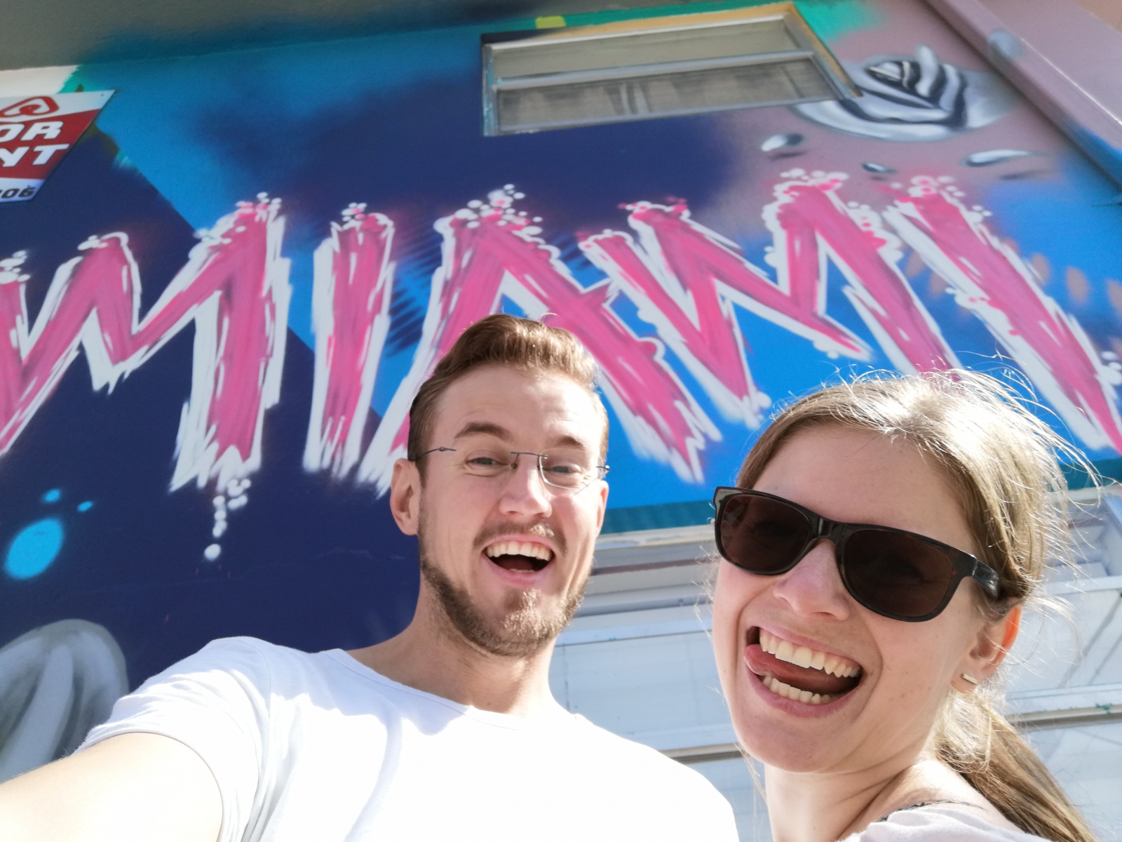 Wir haben uns gleich nach dem Frühstück losgemacht nach Wynwood. Das ist ein Stadtteil von Miami, der für seine Streetart berühmt ist. Und tatsächlich gibt es dort an praktisch jeder größeren Wandfläche teilweise wunderschöne Graffitis. Man fühlt sich ein wenig wie ein Schatzsucher, wenn man durch die Nachbarschaft streift und ständig in Seitengassen und über die Schulter auf die Rückwände von Häusern schaut um wieder ein neues Bild zu entdecken.