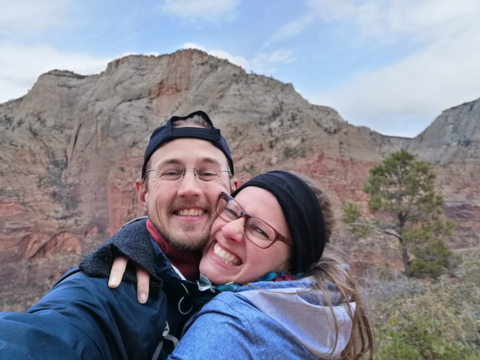 Da der Park diesmal nicht weit weg lag, hatten wir jede Menge Zeit für unser Inklusivfrühstück mit Kakao und Waffeln und Erdnussbutter-Toast. Natürlich auch alles zum Mitnehmen ;-). Gestärkt machten wir uns auf den Weg nach Zion. Dort angekommen, wunderten wir uns über die vielen Leute. Es war wohl ein hervorragender Tag für diesen Park. Die Parkplatzsuche gestaltete sich etwas schwierig. Alles war voll. Aber da man sich im Park ab dem 01.03. nur zu Fuß oder mit Shuttle-Bussen forbewegen darf, mussten wir unser Auto irgendwo abstellen. Mit etwas Kreativität fanden wir ein Plätzchen (und inspirierten auch andere damit). Und dann ging es los zur Bushaltestelle. Wir haben uns mithilfe der Infokarte 2 Wege rausgesucht, die wir an diesem Tag schaffen wollten. Zuerst kam der relativ kurze Riverwalk, aber der war für seine Kürze wunderschön. Das Wasser war super klar, es plätscherte, auf der anderen Uferseite sahen wir eine Rehfamilie und alle anderen Leute haben sich für den parallel laufenden Weg entschieden. Dieser führte an den Anfang eines Wanderweges, den man komplett durchs Wasser beschreitet. Im Bus hatten wir Leute gesehen, die definitiv dieses kleine Abenteuer geplant hatten. Denn sie waren voll ausgestattet mit wasserfesten Klamotten, die sie mit Sicherheit im Park ausgeliehen hatten. Aber es sind uns auch Wanderer entgegen gekommen, die zumindest ein Stück nur mit ihren Turnschuhen gelaufen sind. Ich glaube nicht, dass sie weit gekommen sind bei all den Steinen im Fluss. Und kalt war es auch. Für uns war das ein guter Anfang. Jedoch dachten wir zu dieser Zeit dann, dass nur noch ein Trail zeitlich zu machen ist. Einer der Shuttle-Bus-Fahrer hatte dann auch etwas von nem „einzigartigen“ und „super-steilen“ Trail erzählt. Somit wollten wir dann diesen berühmten Weg – „Angels Landing“ – als Tagesabschluss angehen. Also ab in den Bus und zur richtigen Haltestelle fahren, damit es ganz schnell losgehen kann. Wir liefen und liefen auf dem Trail, bis wir an einem sehr menschengefüllten Platz ankamen – Middle Emerald Pool. Da hat es dann Klick gemacht. Wir waren auf dem falschen Weg gelandet. Diesen wollten wir nur machen, wenn wir noch genug Zeit vorm Sonnenuntergang haben sollten. Doch dann war es auch egal und wir sind noch zum Upper Emerald Pool, da wir eh schon fast da waren. Es hat sich gelohnt und wir konnten absolut verstehen, warum dort nochmal ausdrücklich verboten wurde schwimmen zu gehen. Einmal dort unter dem zarten Wasserfall ne kleine Dusche nehmen, ist definitiv verlockend. Gut, der Rückweg zum eigentlich gewünschten Angels Landing Trail ging dann sehr schnell. Und dann kam der Knaller. Ein gutes Stück Serpentinen, deren Steigung nicht ohne waren, lag vor uns. Aber gut aufgewärmt war das mit 2-3 kleinen Verschnaufpausen kein Problem. Als wir oben angekommen sind, war es aber noch nicht zu ende, wie vermutet. Es ging noch weiter…und wie. Steil, an einer Kette, teilweise links und rechts Abgrund. Auf den ersten Anblick, waren wir erstmal etwas geschockt, dass das tatsächlich erlaubt sein soll (Einfach mal Angels Landing Trail bei Youtube suchen – Liebe Eltern, Ihr wollt das eventuell nicht sehen.). Doch als wir gesehen hatten, wer mit welchem Schuhwerk dort so entlang geklettert, fühlten wir uns auf der sicheren Seite. Schritt für Schritt ging es immer höher immer entlang der Kette, die von uns nicht einmal losgelassen wurde. Es war einfach der Wahnsinn. Schritt für Schritt immer weiter…bis ich langsam zittrige Knie und ein flaues Gefühl im Magen bekam. An einer Stelle mit einem wunderschönen Ausblick war ich dann zufrieden und entschied, dort zu bleiben. Man muss ja seine Grenzen kennen. Paul ging noch weiter, ich habe dort, wo ich war, einfach gewartet.