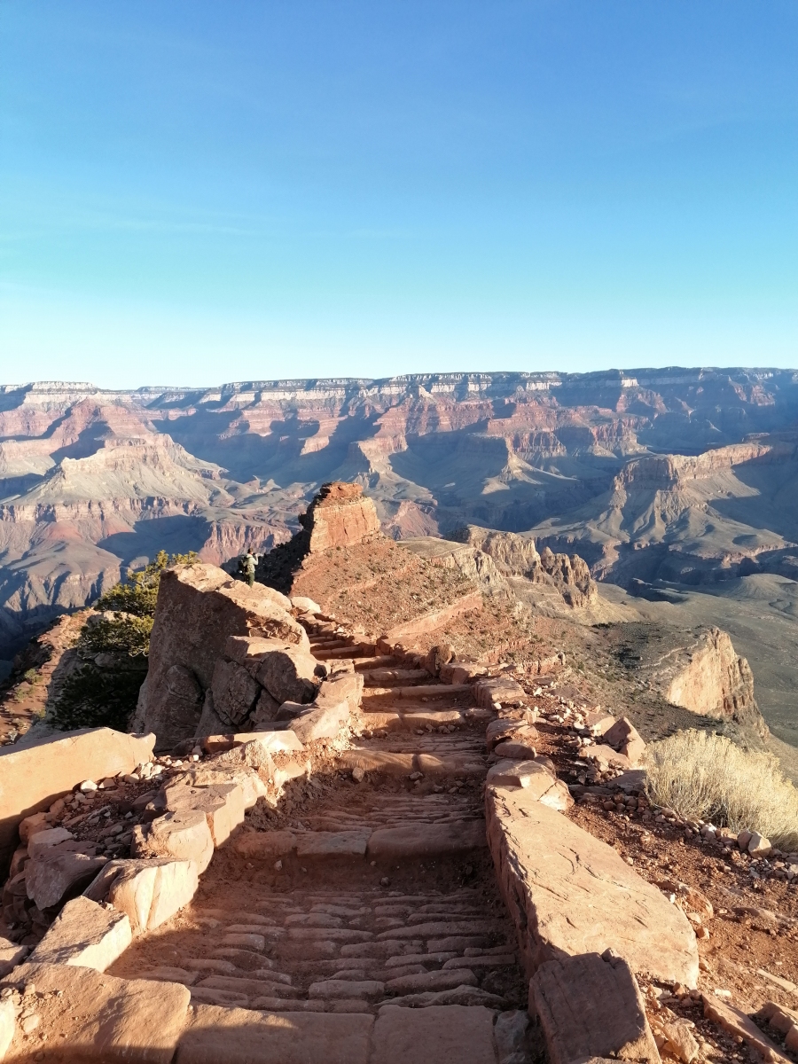 Die Zahl der anderen Wandererinnen nahm weiter ab und der Fluss wurde zum ersten Mal sichtbar. Jetzt nicht mehr das haarfeine Rinnsal, als das er vom Rand erschien, sondern schon etwas…nun ja „flussiger“. Man konnte zum ersten Mal erahnen, dass da was Kräftiges floss. Was auch immer deutlicher wurde, waren die tatsächlichen Ausmaße des Canyons. Der Rand stieg immer höher hinter uns und diesmal konnte man die Distanzen und Dimensionen ganz anders verstehen. Man fühlt sich dann doch sehr klein zwischen so enormen Felswänden, auch wenn sie 16km auseinander liegen. Direkt vor sich schauen muss man aber natürlich auch immer, sonst kann man zum Beispiel in eine Baustelle krachen. Ja, mitten auf dem Wanderpfad versperrte plötzlich ein Maultier den Weg. Dahinter: weitere Maultiere. Die brachten stetig Schutt den Pfad hinauf, um Erosion und abgerutschte Wegteile wieder ausbessern zu können. Geschaufelt wurde vom Vorarbeiter dann von Hand – da können Mulis ja nun nicht helfen. Als alles abgeladen war durften wir der Karavane folgen und dann auch überholen.