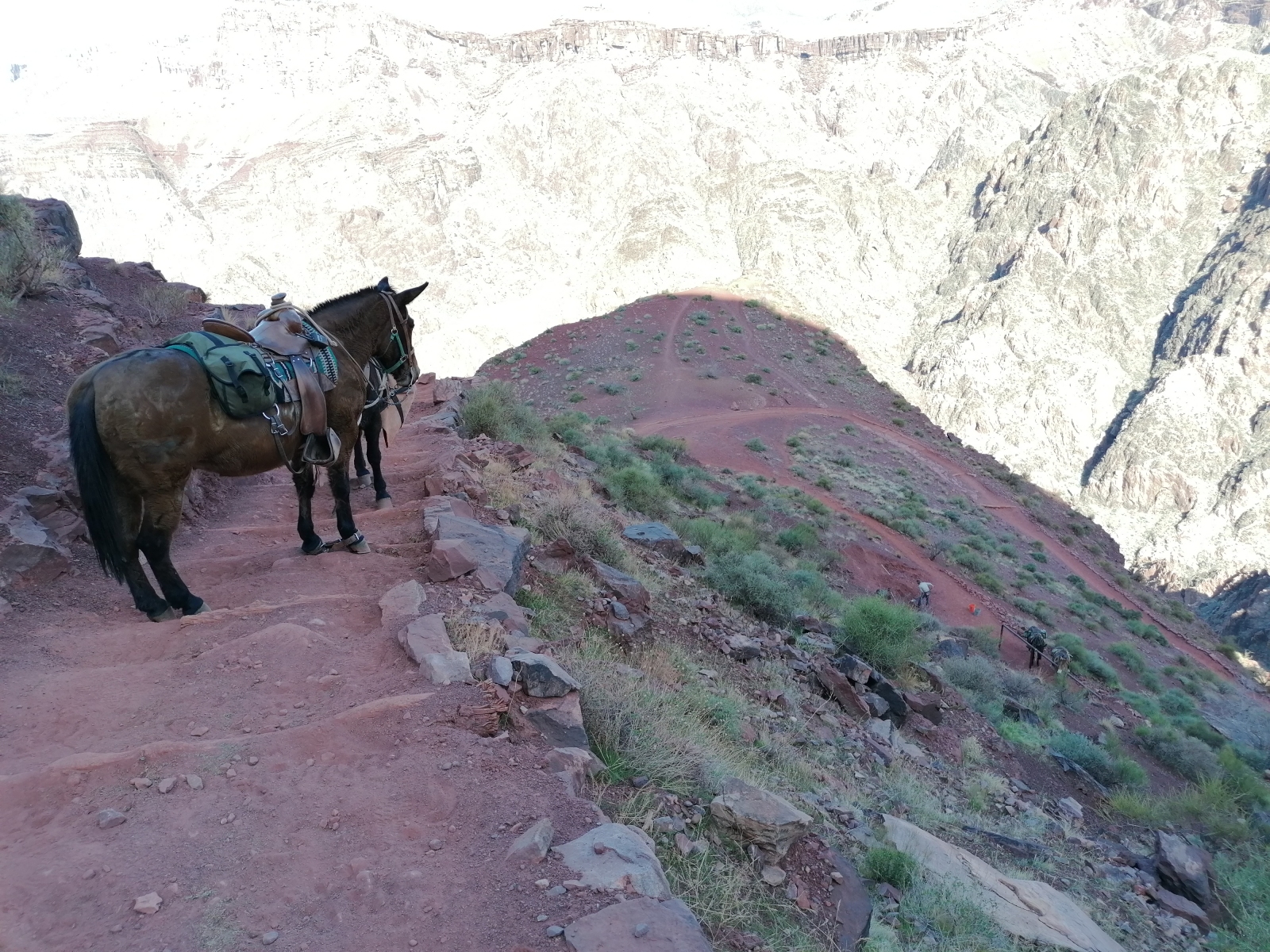 Die Zahl der anderen Wandererinnen nahm weiter ab und der Fluss wurde zum ersten Mal sichtbar. Jetzt nicht mehr das haarfeine Rinnsal, als das er vom Rand erschien, sondern schon etwas…nun ja „flussiger“. Man konnte zum ersten Mal erahnen, dass da was Kräftiges floss. Was auch immer deutlicher wurde, waren die tatsächlichen Ausmaße des Canyons. Der Rand stieg immer höher hinter uns und diesmal konnte man die Distanzen und Dimensionen ganz anders verstehen. Man fühlt sich dann doch sehr klein zwischen so enormen Felswänden, auch wenn sie 16km auseinander liegen. Direkt vor sich schauen muss man aber natürlich auch immer, sonst kann man zum Beispiel in eine Baustelle krachen. Ja, mitten auf dem Wanderpfad versperrte plötzlich ein Maultier den Weg. Dahinter: weitere Maultiere. Die brachten stetig Schutt den Pfad hinauf, um Erosion und abgerutschte Wegteile wieder ausbessern zu können. Geschaufelt wurde vom Vorarbeiter dann von Hand – da können Mulis ja nun nicht helfen. Als alles abgeladen war durften wir der Karavane folgen und dann auch überholen.