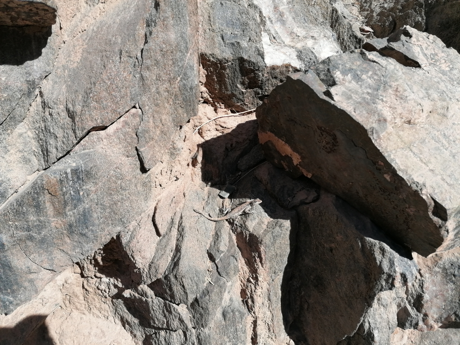 Der Pine Canyon ist nur auf einer unbefestigten Sandstraße zu erreichen. Hier gibt es keine entwickelten Campingplätze, sondern nur Schotterflächen mit Bärenboxen. Ja hier im Big Bend gibt es (Schwarz-)Bären, Pumas und Javelinas, die auf unser Essen (oder uns?) abfahren könnten. Da es auch keine Toiletten gab, wurde uns (mir sogar das erste Mal) erklärt, wie und wo man sein großes Geschäft verbuddeln soll – dig a nice deep hole a couple of meters away. Jaaa, das haben wir uns dann mal verkniffen… Die Sonne brannte. Es wehte kein Lüftchen. Und es gab keine Bäume um unsere Plane zu befestigen. Mit einer kleiner Notlösung haben wir immerhin 2m² Schatten kreieren können. Dann hat erstmal jeder sein Ding gemacht. Paul wollte natürlich auf den Berg hinter uns um einen besseren Ausblick zu gewinnen. Ich habe mir eine meditationsähnliche Pause gegönnt um die Umgebung besser wahrzunehmen. Dazu kann ich sagen, dass es sehr leise war. Es gab fast keine Geräusche, sodass der Flügelschlag der Vögel sogar herausstach. Neben Fliegensurren und dem Rascheln von Pauls Bergkraxeln, gab es nichts als Stille. Wahnsinn!