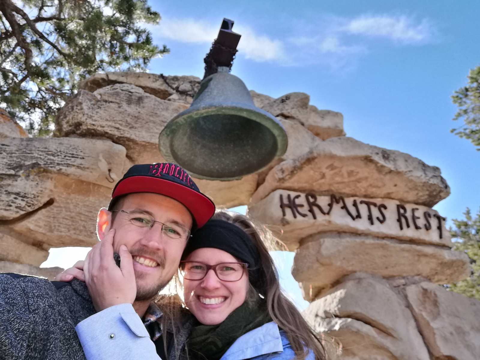 Ein direkter Wiederaufstieg war aber nicht unser Plan, da wir nicht den selben Pfad zurück gehen wollten. Stattdessen ging’s am Fluss entlang zu einem anderen Trail, der uns wieder herauf zum South Rim bringen sollte. Der Bright Angel Trail führte uns die erste Zeit entlang kleinerer Zuflüsse (es ist ja noch Tauzeit oben auf dem Canyon) langsam aber stetig immer weiter aufwärts. Wir durften ein paar Mal die erfrischenden kleinen Bäche und Rinnsale kreuzen, was uns Gelegenheit zur Abkühlung gab. Es wurde aber auch immer deutlicher, dass der Aufstieg die größere Herausforderung ist. Zum Einen, ist der Bright Angel Trail schon für sich etwas länger, als der South Kaibab. Zum Anderen war das wunderbare Wetter dann doch manchmal (zummindest für mich) sehr warm. Wenn man dann schon über 10km anspruchsvolle bergab-Wanderung in den Knochen hat, geht man schon mal in sich. Aber dann holt einen doch wieder die atemberaubende Umwelt ein oder ein Gummibärchen gibt neuen Saft und weiter geht’s. Nach dem letzten größeren Zwischenhalt – Indian Gardens genannt – wollten wir dann nur noch ankommen. noch ca. 4,5 Meilen vor uns und wer weiß wie viele Höhenmeter. Unsere Lieblingssongs beim Aufstieg? Step by Step, (Keep on) Rollin‘, Almost There… Das Motto war weiterlaufen. Ein bisschen kamen wir uns wie die Mulis vor. Stell keine Fragen, Lauf! Außer, dass wir uns selber dafür entschieden hatten. Der Canyon wurde dann auch psychologisch herausfordernder, weil er nach oben kein Ende zu haben schien. Du siehst die Spitze? Schau mal um die Kurve, da noch weiter oben. Noch ne Spitze. Und dahinter? Genau, noch ne höhere Spitze. Immer weiter. Und umdrehen würde ja auch nix bringen. Das is schon gemein. Wie warnen die Ranger hier: „Hiking into the canyon is voluntary, hiking out of the canyon is mandatory“. Kein Stoppen also. Die langsam zunehmende Zahl der Touristinnen war der einzige Indikator, dass der South Rim zumindest in erreichbare Nähe gerückt sein musste. Auch die Zwischenziele gaben Sicherheit. Das 3-Mile-Resthouse (3 Meilen vorm Ziel) das 1,5-Mile-Resthouse… und dann: die letzten Serpentinen. Natürlich zur Krönung sehr steil und mit Traktions-Bonus weil stellenweise vereist. Da freuen sich die müden Knochen aber nicht. Faszinierend dennoch, wie auf einmal der Nachbrenner zündete, als wir endlich wirklich den Rand sehen konnten. Die letzten Meter haben wir also fröhlicher geschnauft (schneller war nicht mehr wirklich drin) und sogar noch den einen oder anderen Spaziergänger überholt. Am Ende war nach 9.03 Stunden der Trailhead des Bright Angel Trail erreicht und wir hätten kaum glücklicher sein können. Wir hatten mit 10,5 oder 11,5 Stunden geplant. Es machte sich sehr erschöpfte Euphorie breit. Von wegen „nicht innerhalb eines Tages“…