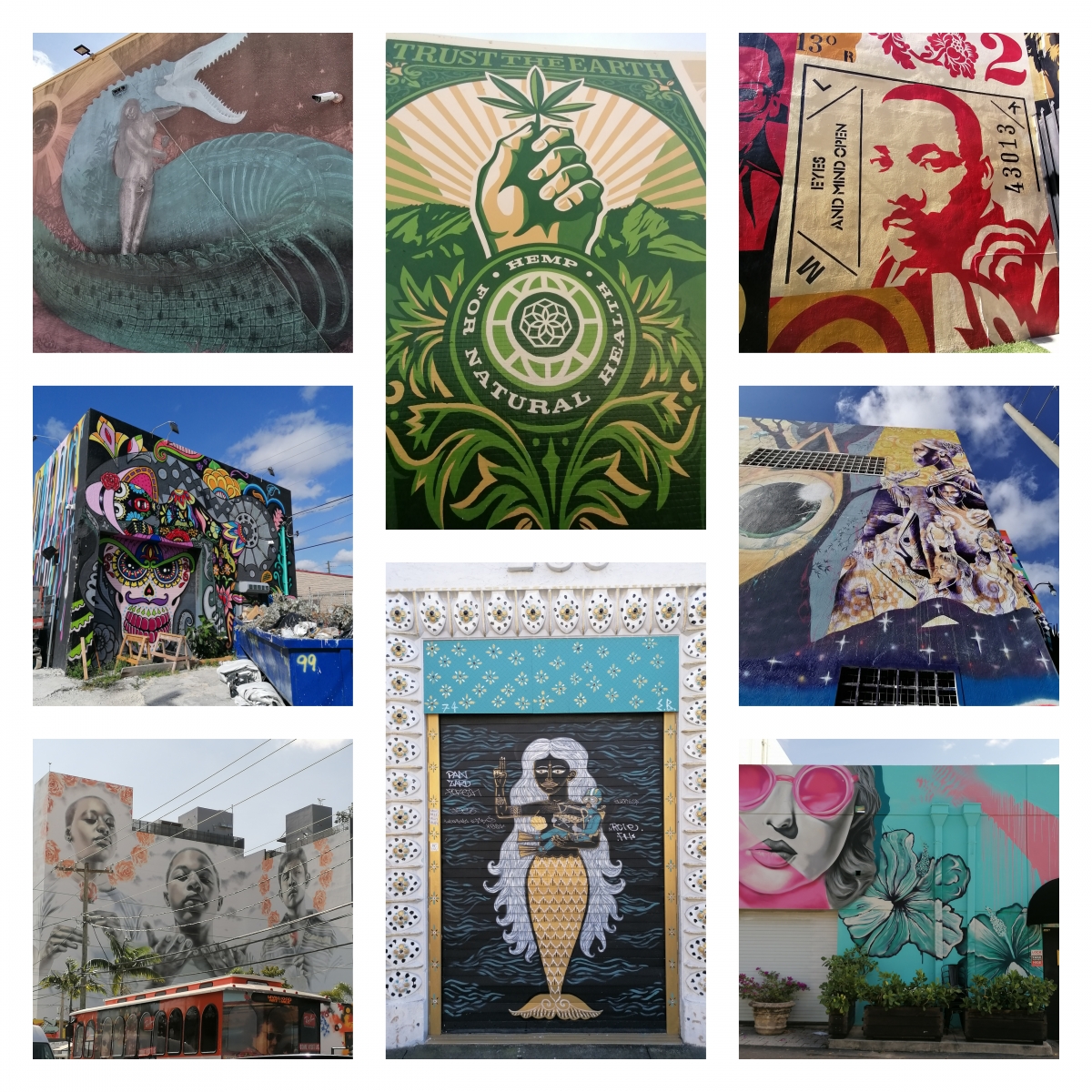 Wir haben uns gleich nach dem Frühstück losgemacht nach Wynwood. Das ist ein Stadtteil von Miami, der für seine Streetart berühmt ist. Und tatsächlich gibt es dort an praktisch jeder größeren Wandfläche teilweise wunderschöne Graffitis. Man fühlt sich ein wenig wie ein Schatzsucher, wenn man durch die Nachbarschaft streift und ständig in Seitengassen und über die Schulter auf die Rückwände von Häusern schaut um wieder ein neues Bild zu entdecken.